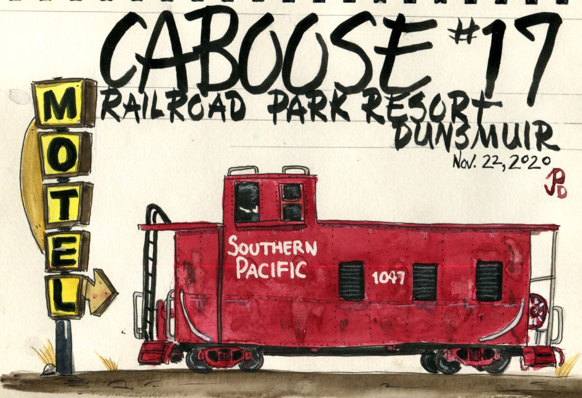 I put my bags in the caboose, grabbed by sketching bag and chair, and picked my spot to sketch Caboose #17. To the left of the caboose was a sign that proclaimed like a proud exclamation mark: “MOTEL!” with an arrow that shot out of the “L“, pointing to the red caboose as if to proclaim to the unbeliever that, “Yes, you can stay in this caboose!”