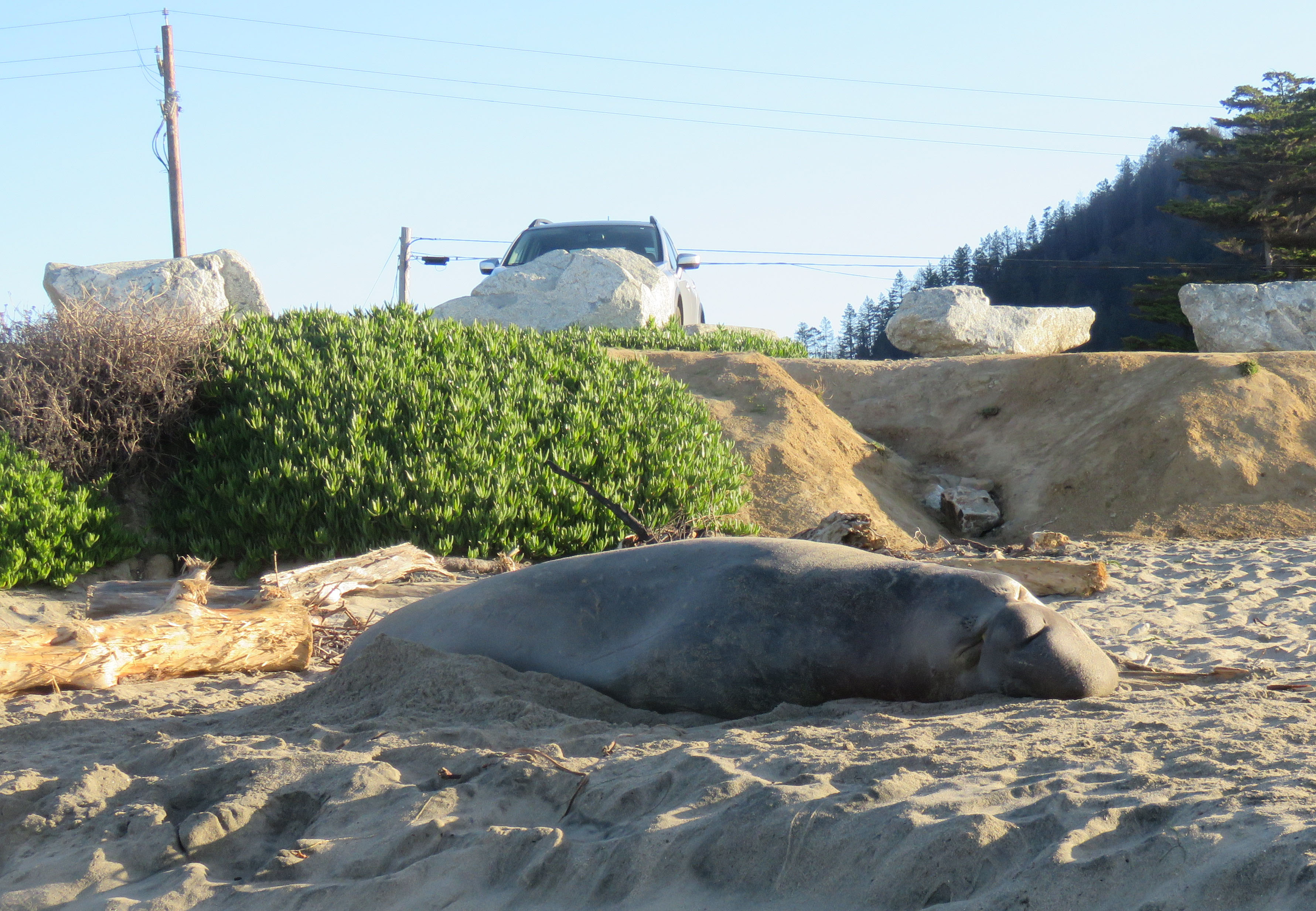 The view from the parking lot. Seems so hard to miss.Here is my car to provide some scale.This young male northern elephant seal looks like he has been in a few scuffles by the number of scars on his body. He is defiantly the beach master of this beach.