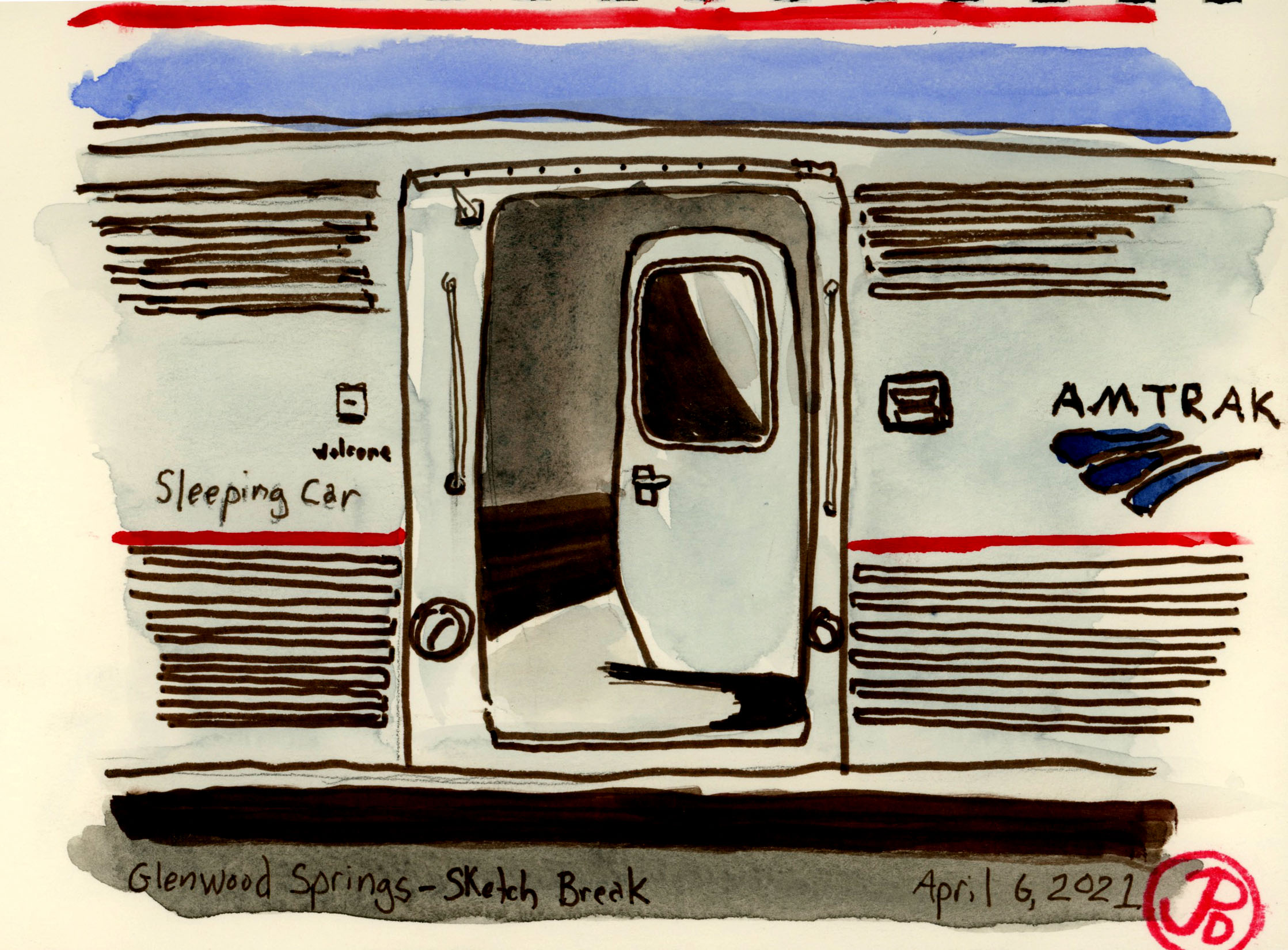 A quick sketch of my Sleeping Car entrance during a sketch break at Glenwood Springs. My sleeping car was just behind the locomotives. I added watercolor once I was back in my roomette.