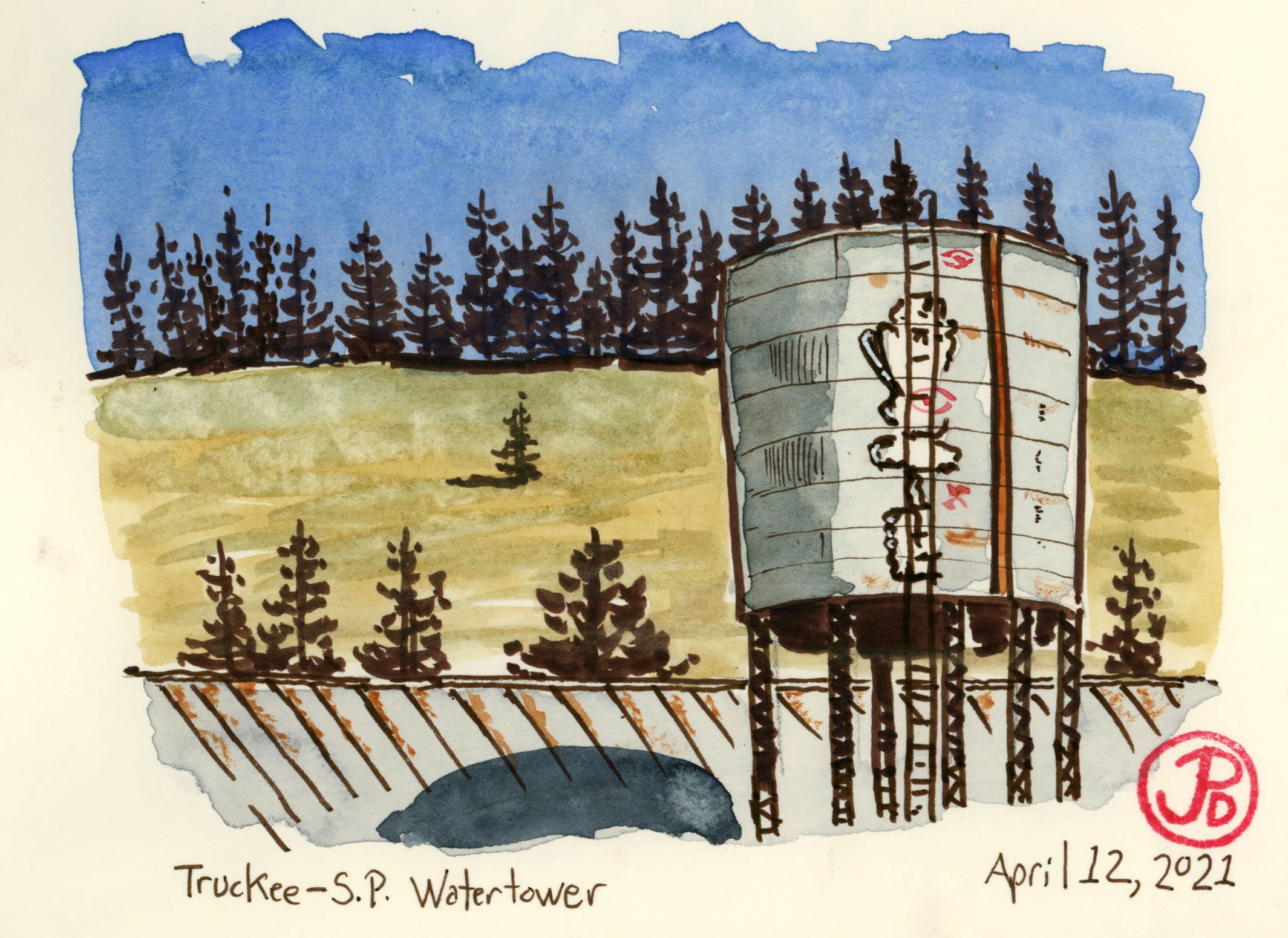 I had spent time during the last year sketching the existing Southern Pacific water towers. So I knew the form well. I was surprised to see from my Superlunar perch, an existing water tower as we pulled out of Truckee to climb Donner Pass. I have been to Truckee many times but I had never seen this tower. I returned later to capture the water tower. There are 15 surviving examples in California. I have seen about five.