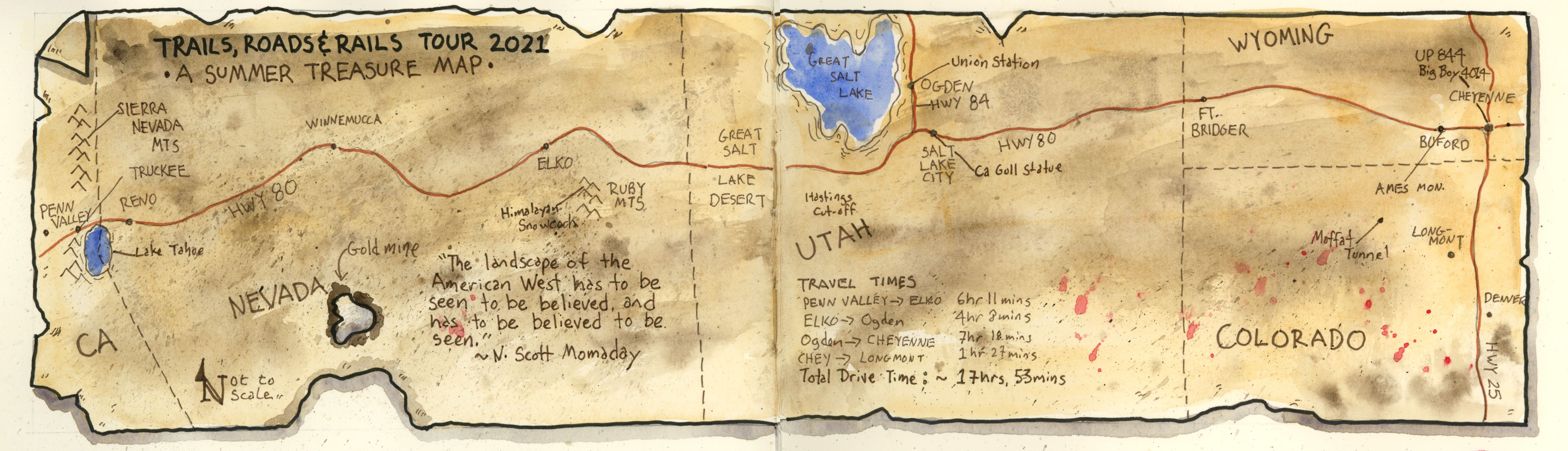 As I do before any important journey I sketch out the route. In this case I chose to represent the map as a distressed treasure map or perhaps a map to a secret goldmine, like Dr. Buckbee’s map in the Gold Rush classic By the Great Horn Spoon.