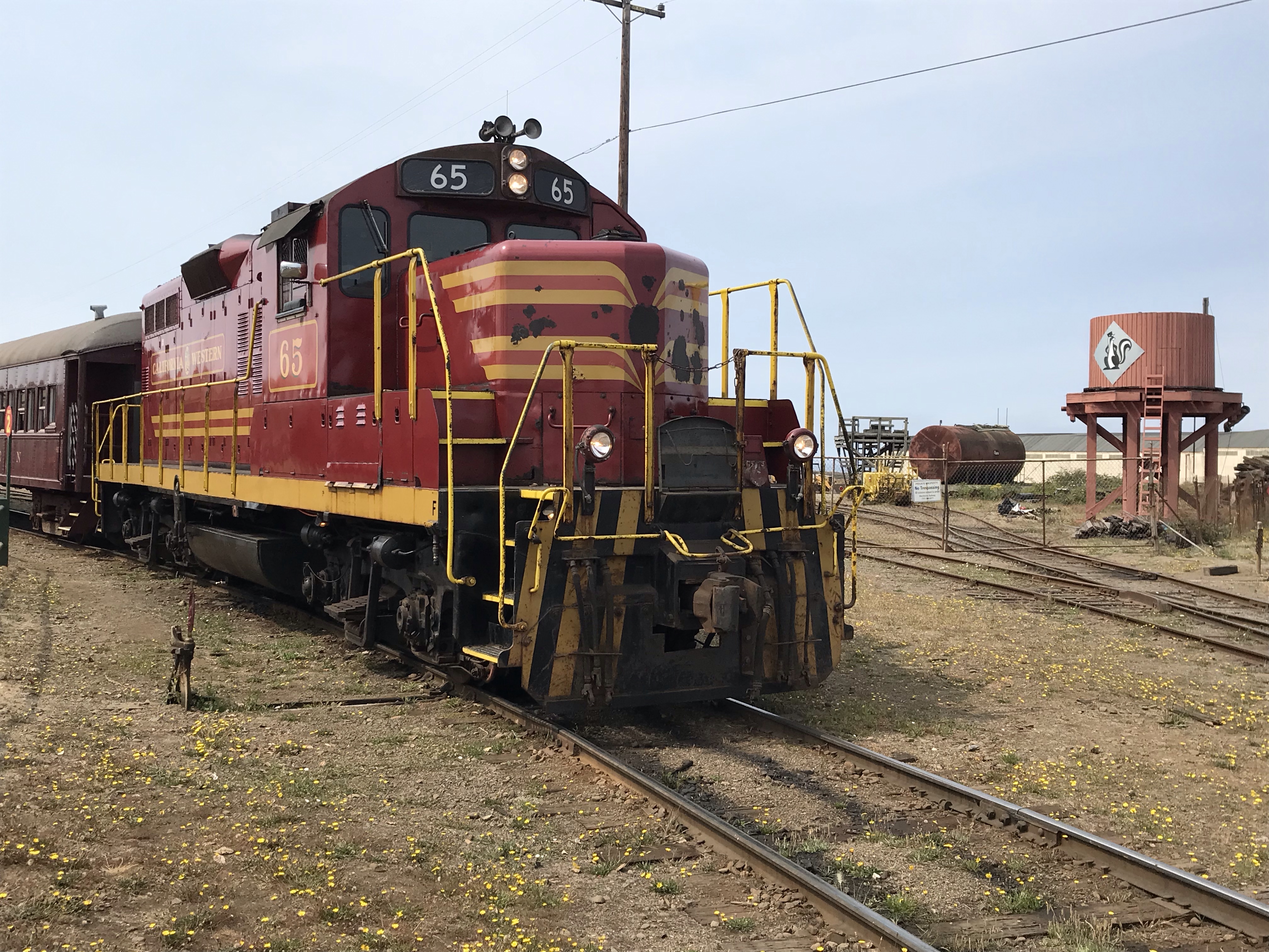 The Skunk at Ft. Bragg. The water tower is for No. 45, a Mikado steam locomotive. Our train (No. 65) was pulled by a former Southern Pacific GP9 diesel built in 1955 by EMD.