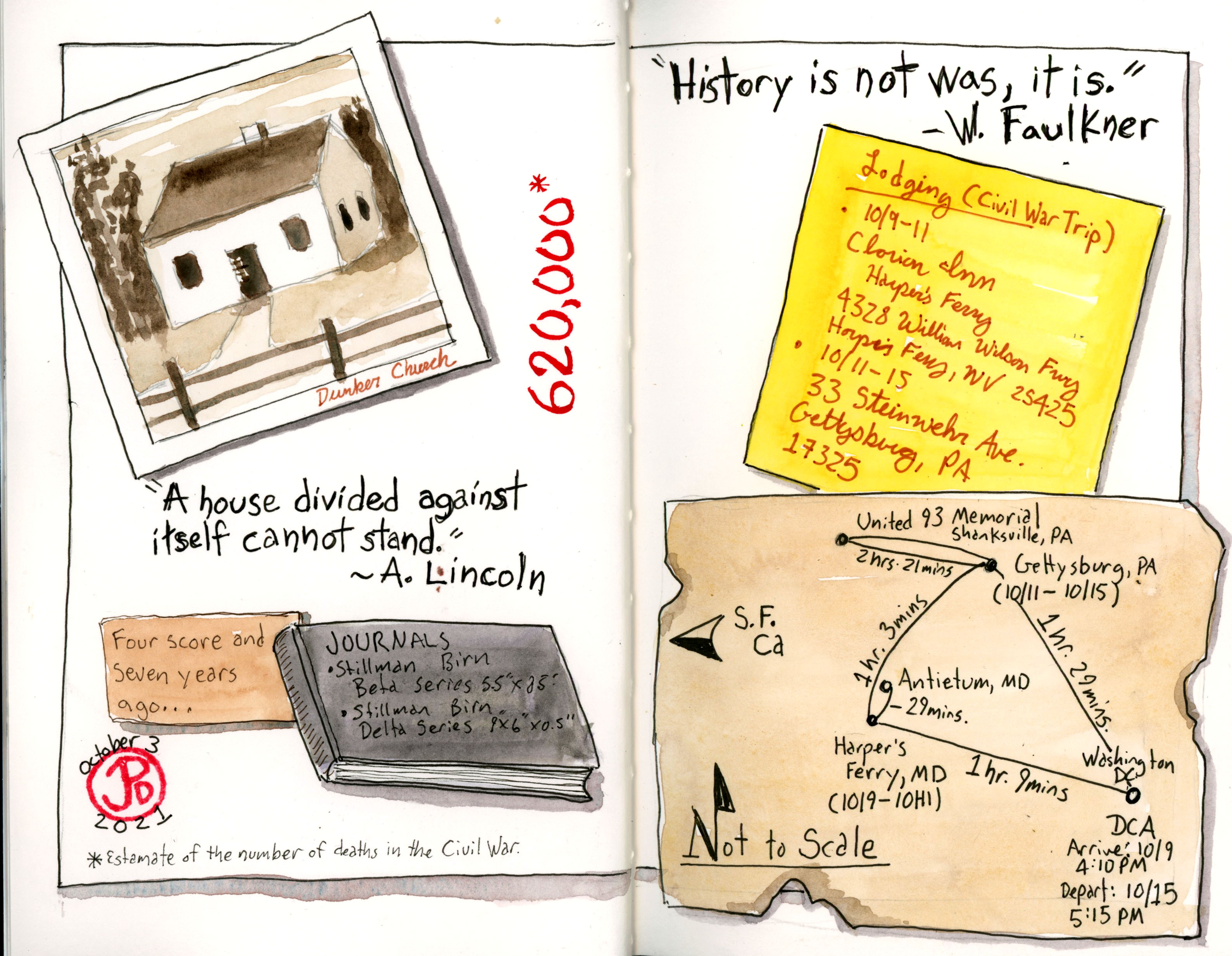 In my Beta sketchbooks I created a map of the places I would be visiting. All of the locations I would be visiting where within 90 minutes of each other. I distressed the map, covering it in mud and blood. Perhaps I added too much “blood”, but somehow since this is the Civil War it was fitting. It is estimated that about 620,000 Americans lost their lives during the Civil War.
