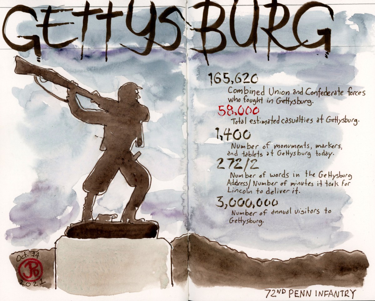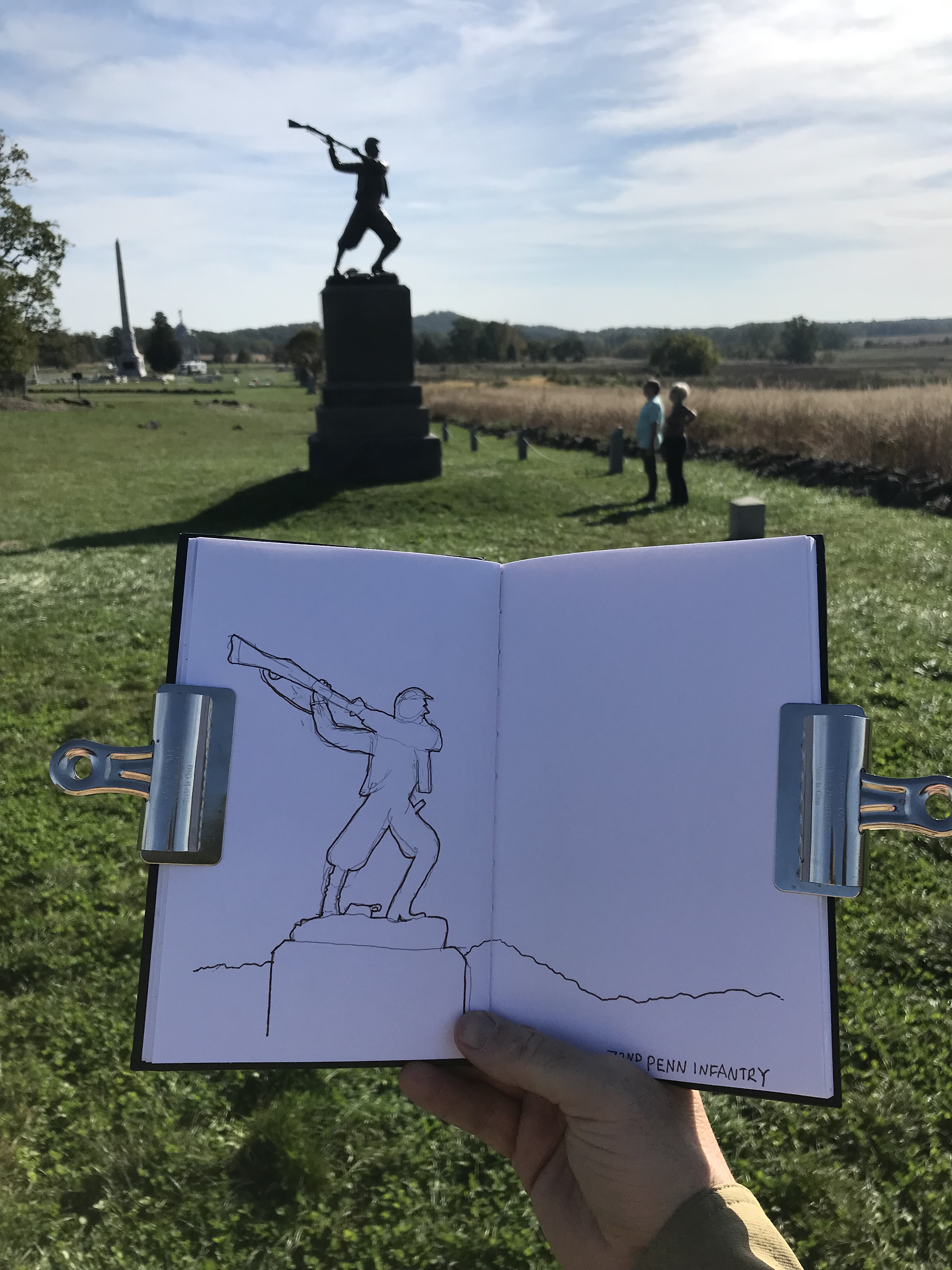Here I am field sketching the 72nd Pennsylvania Monument at the Highwater Mark, the climax of the Battle of Gettysburg as two people admire what is one of the most iconic statues on the battlefield.This is largest monument at Gettysburg and it’s fitting that it is the Pennsylvania Monument.