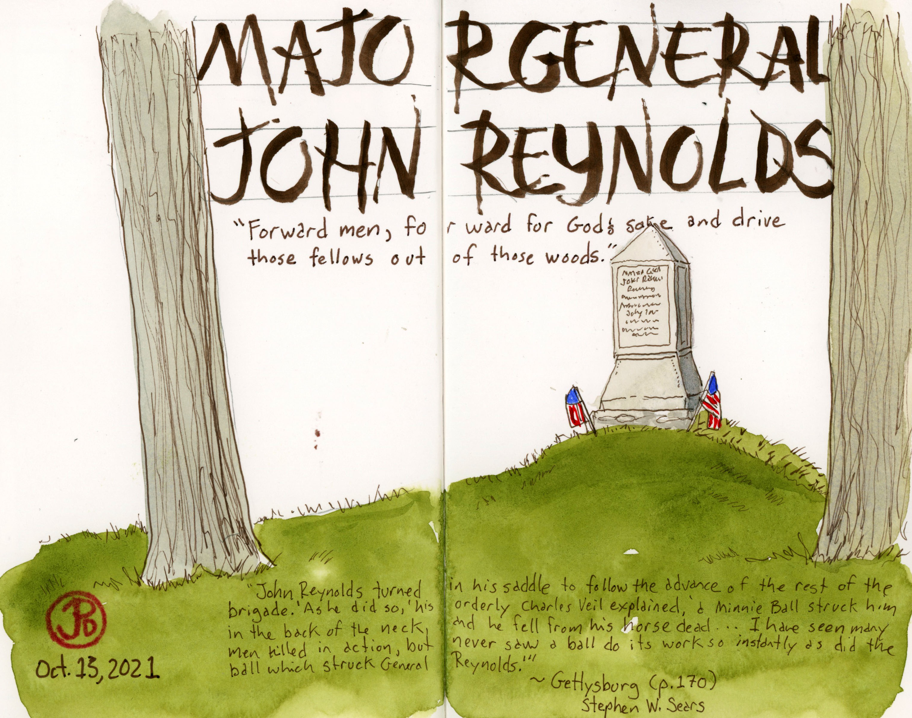 This is one of the many monuments on the Gettysburg Battlefield. This monument marks the spot where General John Reynolds was shot and killed on the morning of July 1, the first day of the battle. Reynolds was they highest ranking officer killed at Gettysburg.