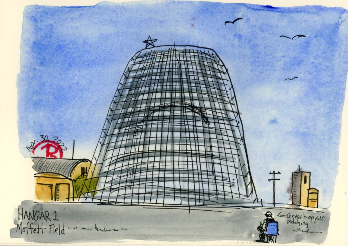 Sketching Notes: I sketched the framework of Hangar 1. I was more focused on shape and form than the individual details. I sketched in Grasshopper in the foreground for scale. He was sketching the water tower to the left of Hangar 1.