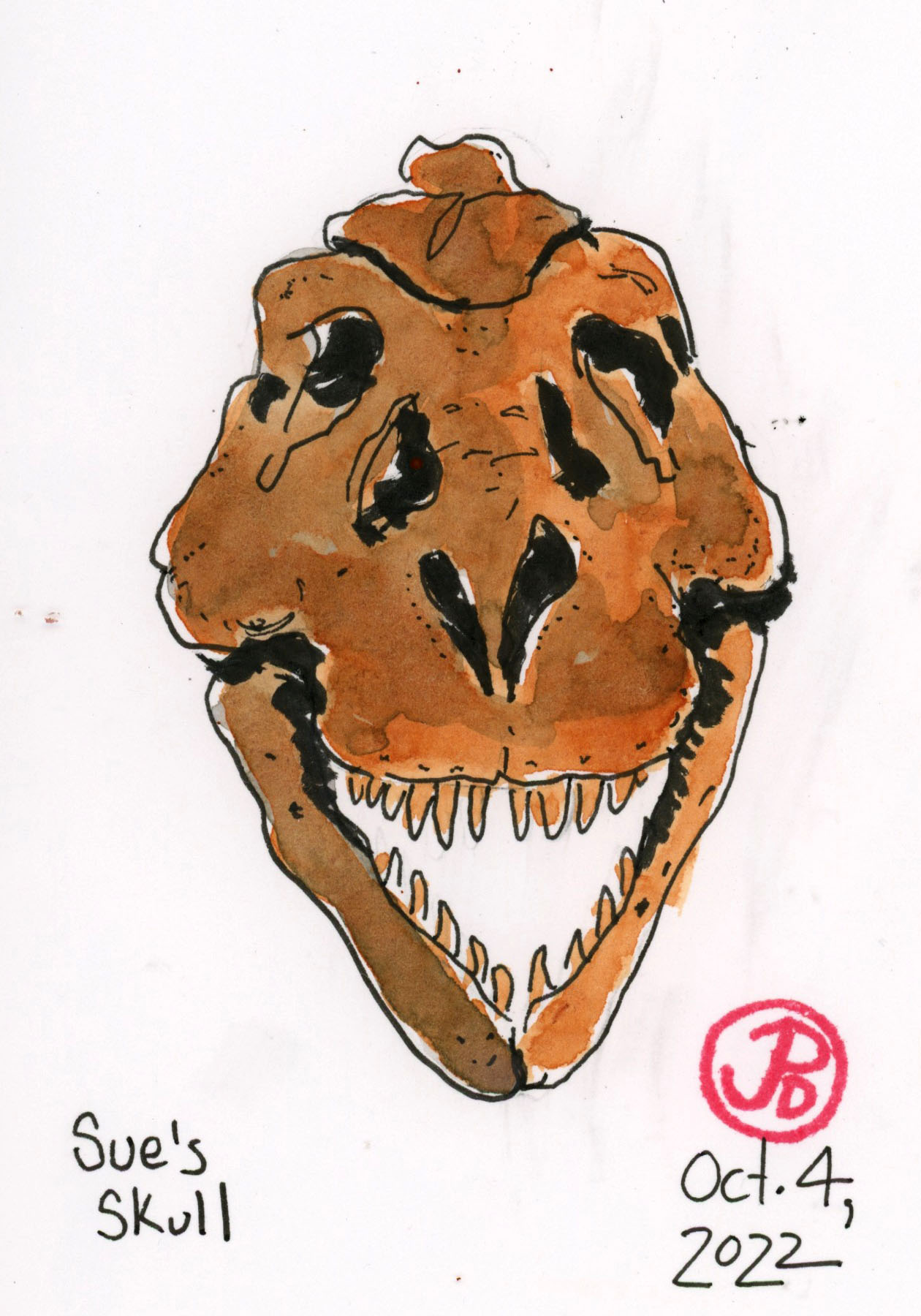 I sat before the 40.5 feet long and 13 foot tall Tyrannosaurus rex skeleton which, out of the 30 unearthed other T. rex skeletons, is the most complete (at 90%) and the largest in existence. I opened my sketchbook and put the remains in my pages.
