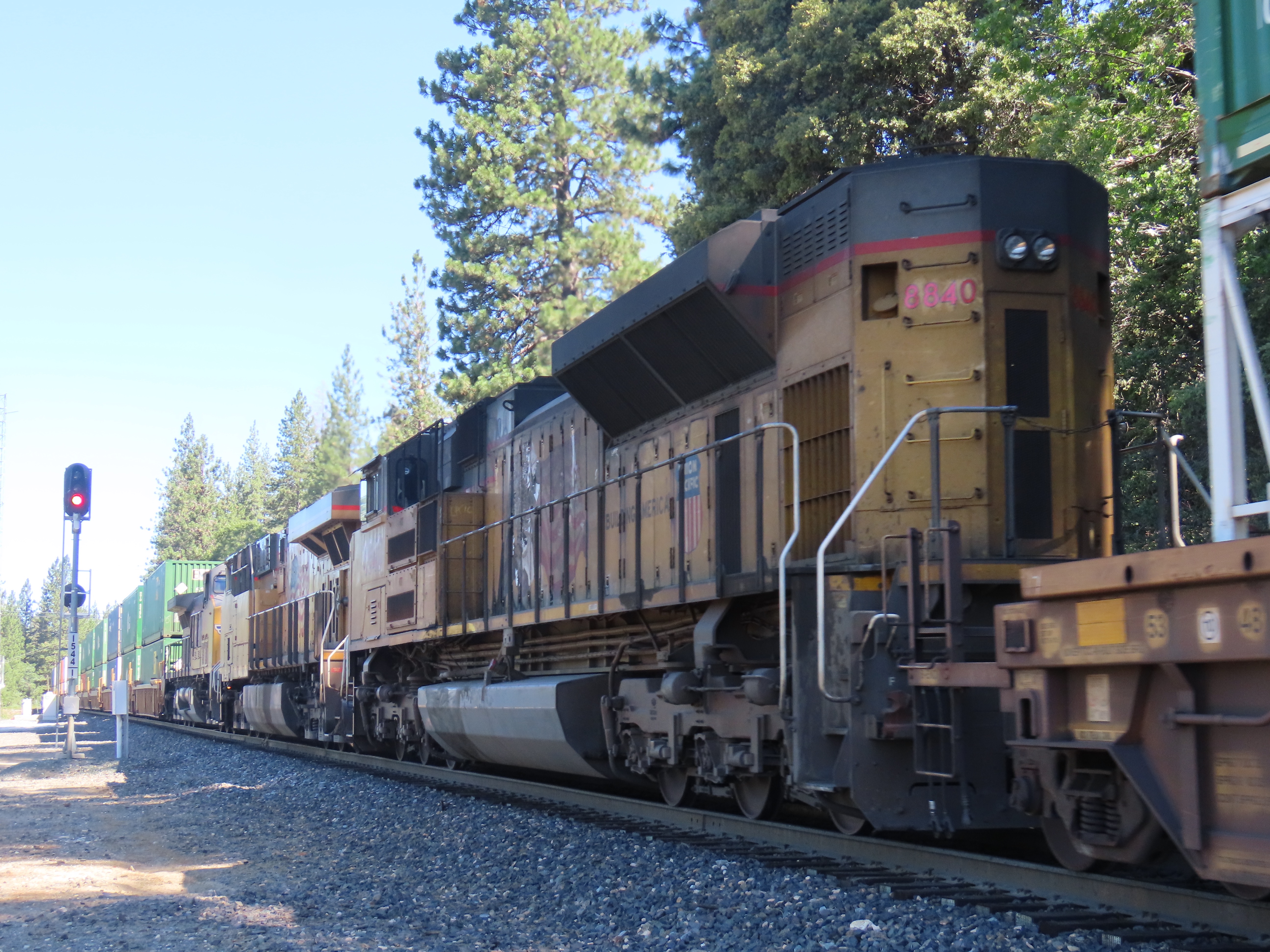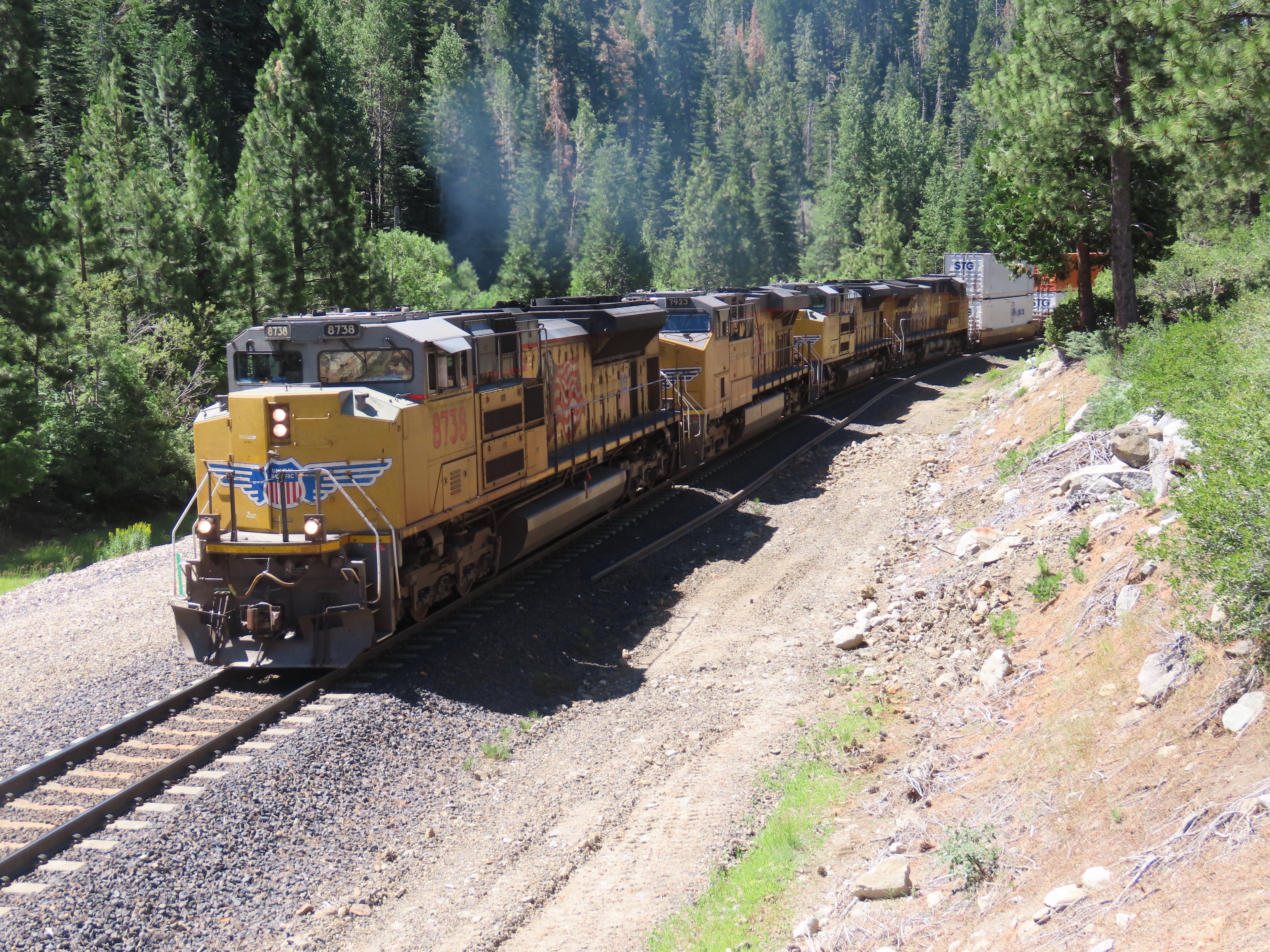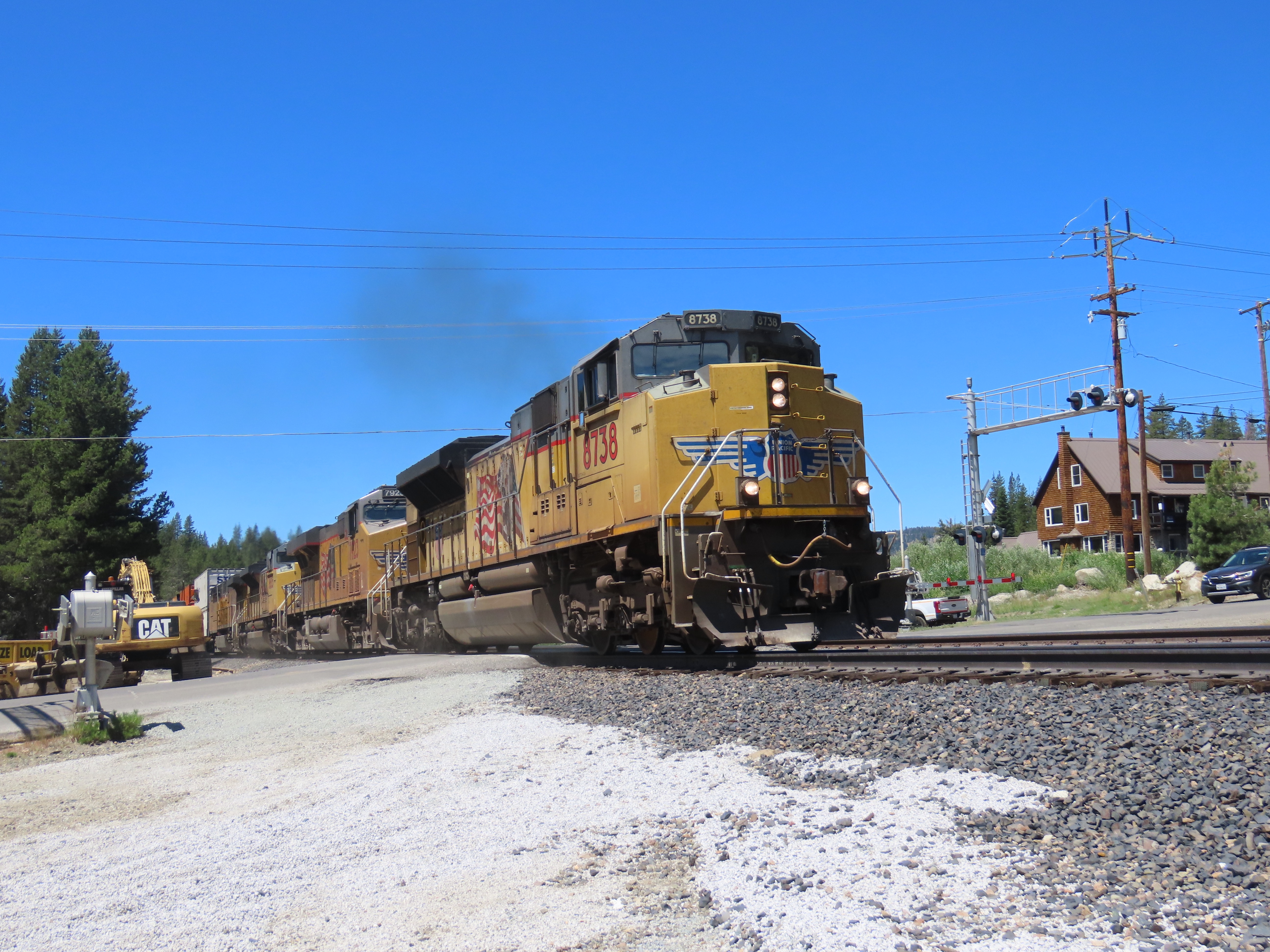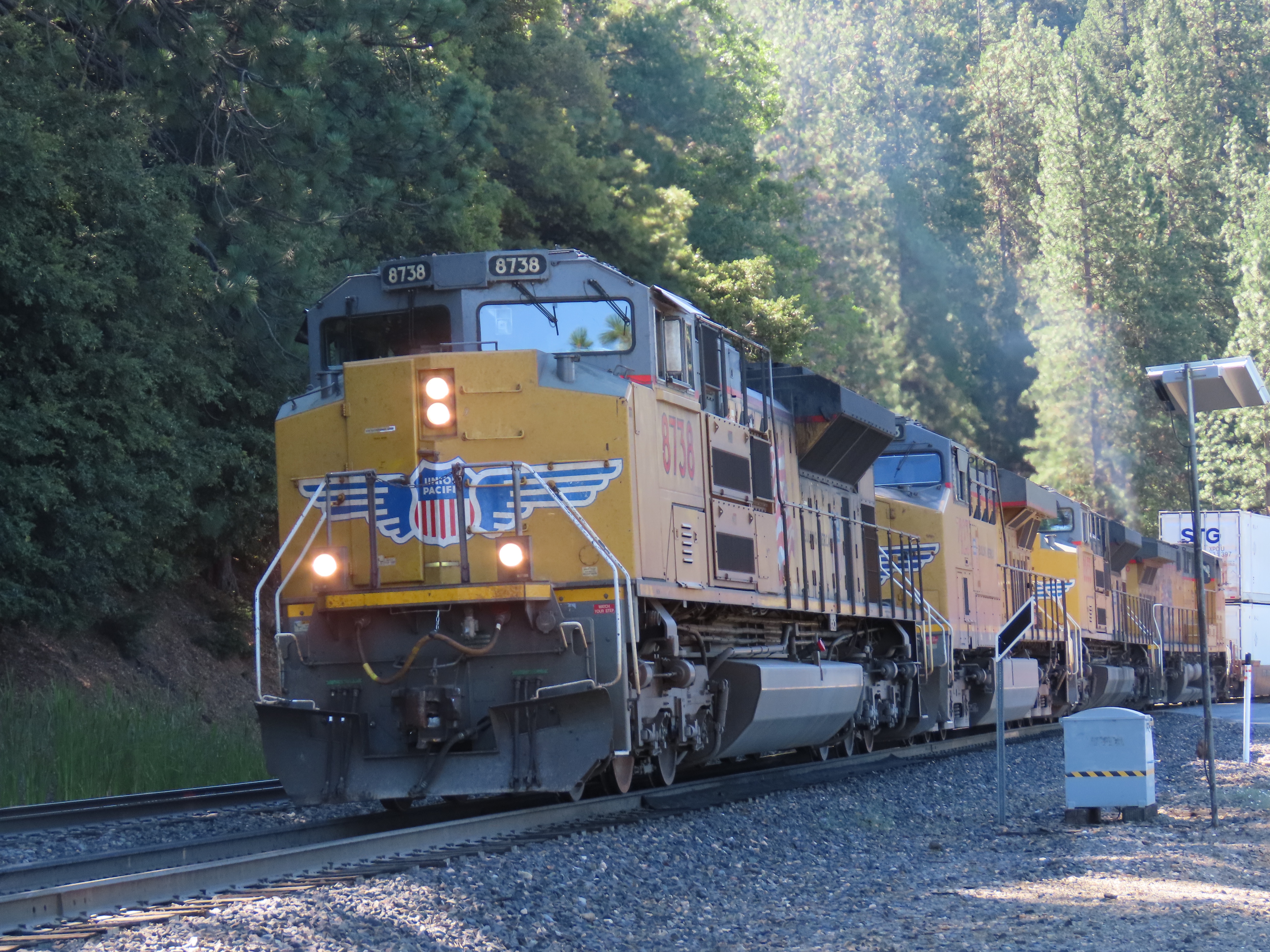 Union Pacific No. 8738 came into view. No. 8738 is an Elctro-Motive Diesel (EMD) SD70ACe. These 408,000 pound locomotives generate 4,300 pounds of horsepower and this consist featured four locomotives on point and three more mid-train. These seven locomotives generate a combined 30,200 pounds of horsepower. They need this power to pull/push the heavy loads up and over Donner Summit.