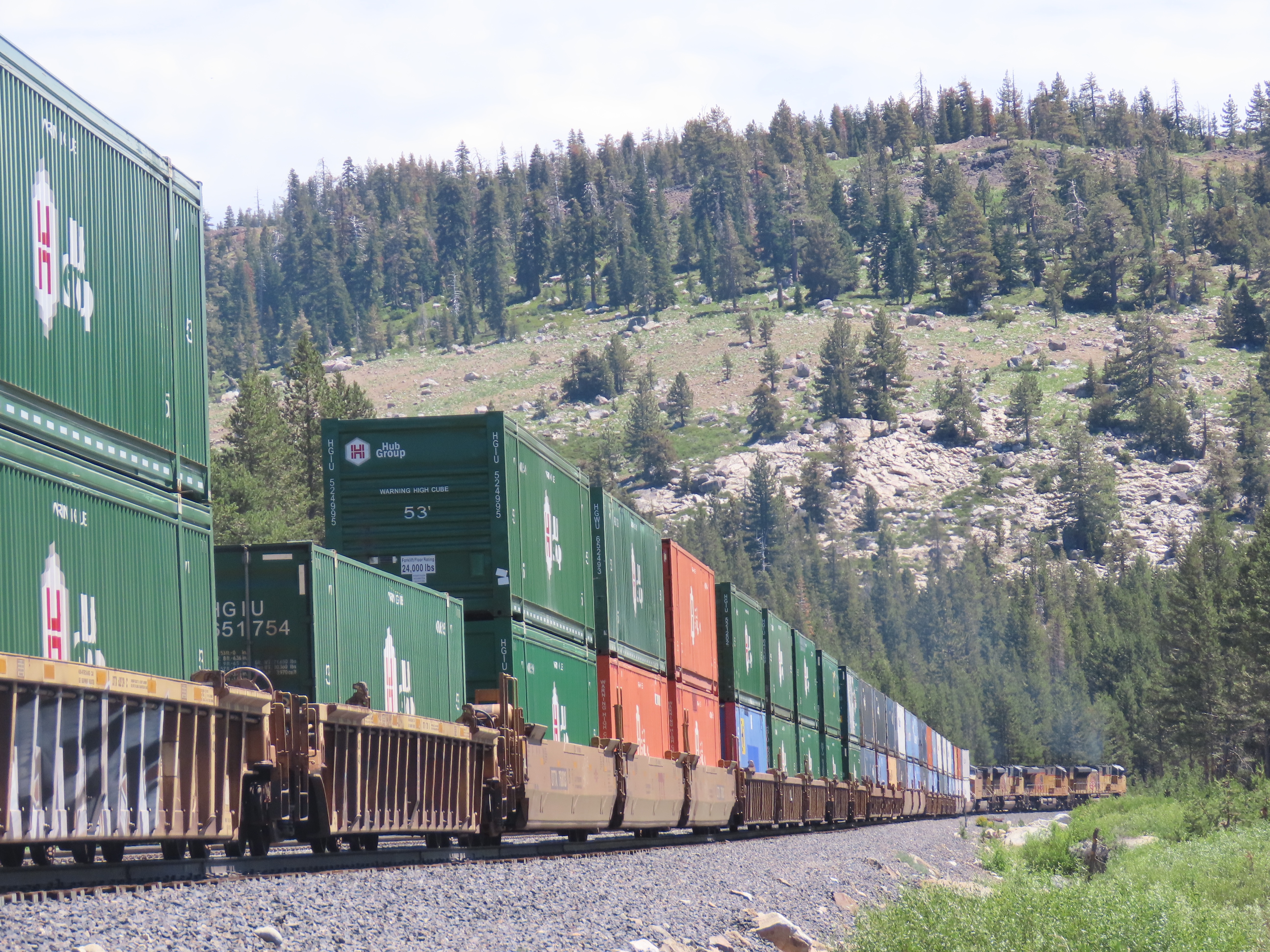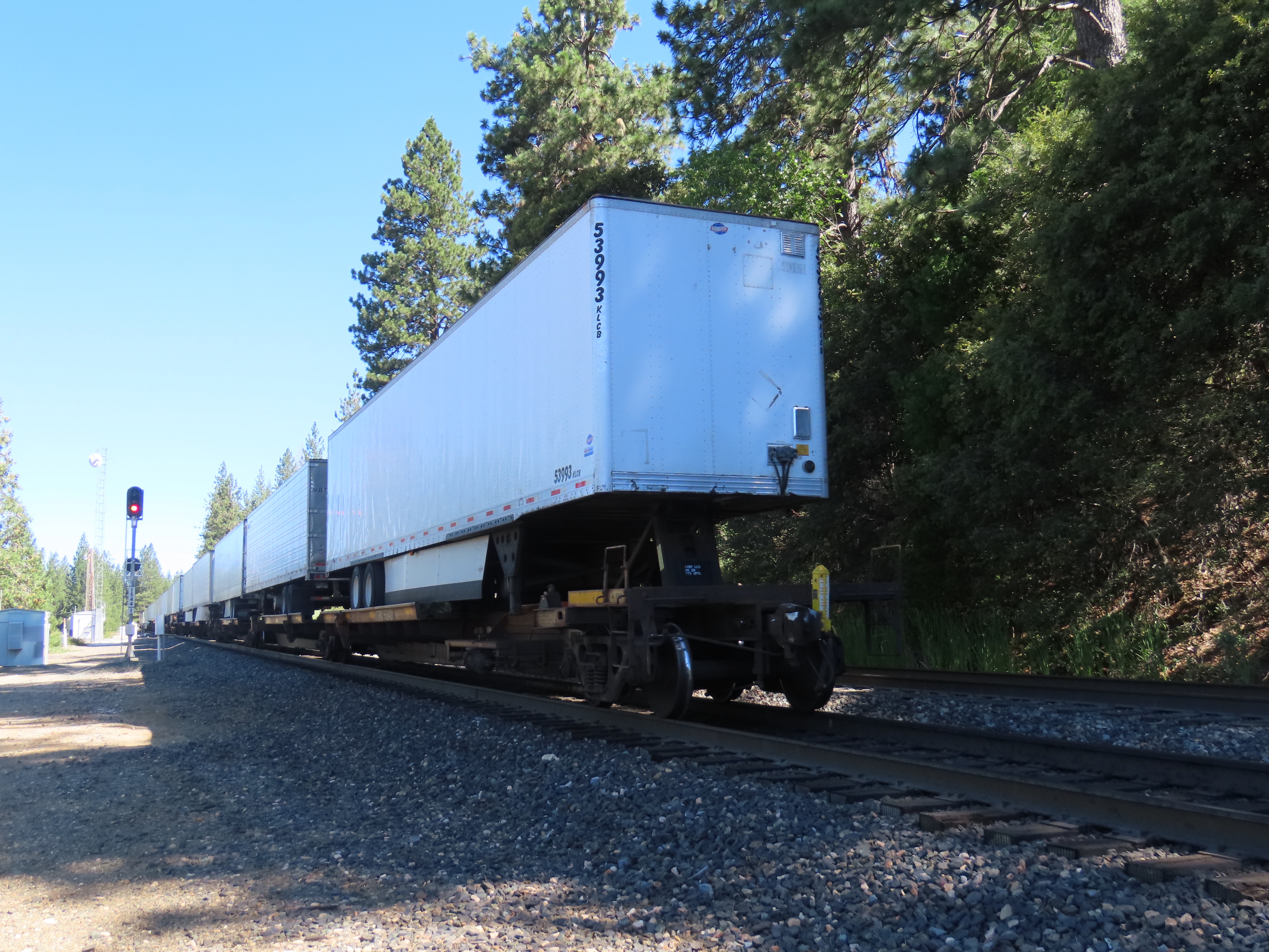 Intermodal is freight that is transported by various forms of transportation: ships, trains, planes, and trucks, for example. Most of the intermodal freight trains across the Sierra Nevada consist of double stacked freight containers, known as Container on Flatcar (COFC), or single truck trailers on flat cars, known as Trailer on Flatcar (TOFC) or piggybacks.