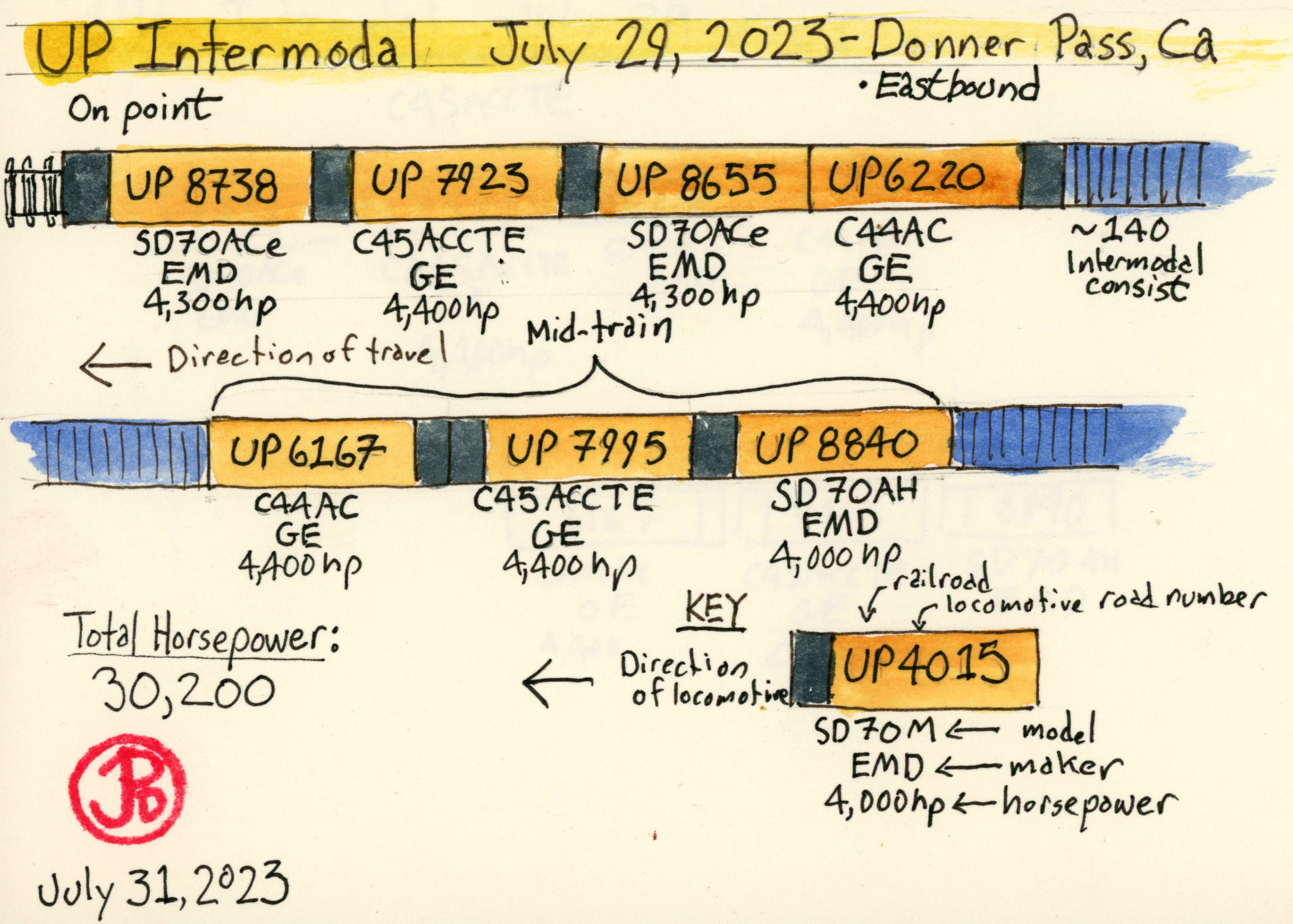 Based on my field photos I was able to get the road numbers of all seven locomotives on the freight train. Using a Union Pacific roster I was able to identify the maker and model of each locomotive and it’s horsepower output. There where three EMD (Electro-Motive Diesel Inc.) and four GE (General Electric) locomotives. I put this information into a locomotive map showing the road number, model, maker, horsepower, and direction of travel for each locomotive. The total horsepower output for all seven locomotives was 30,200 hp.