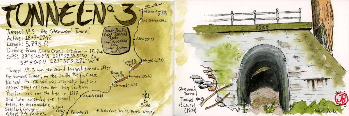 On a historic rail sketching adventure, Grasshopper and I headed up into the Santa Cruz Mountains to sketch a portal of one of the longest rail tunnels on the former South Pacific Coast Railroad (later Southern Pacific) route.