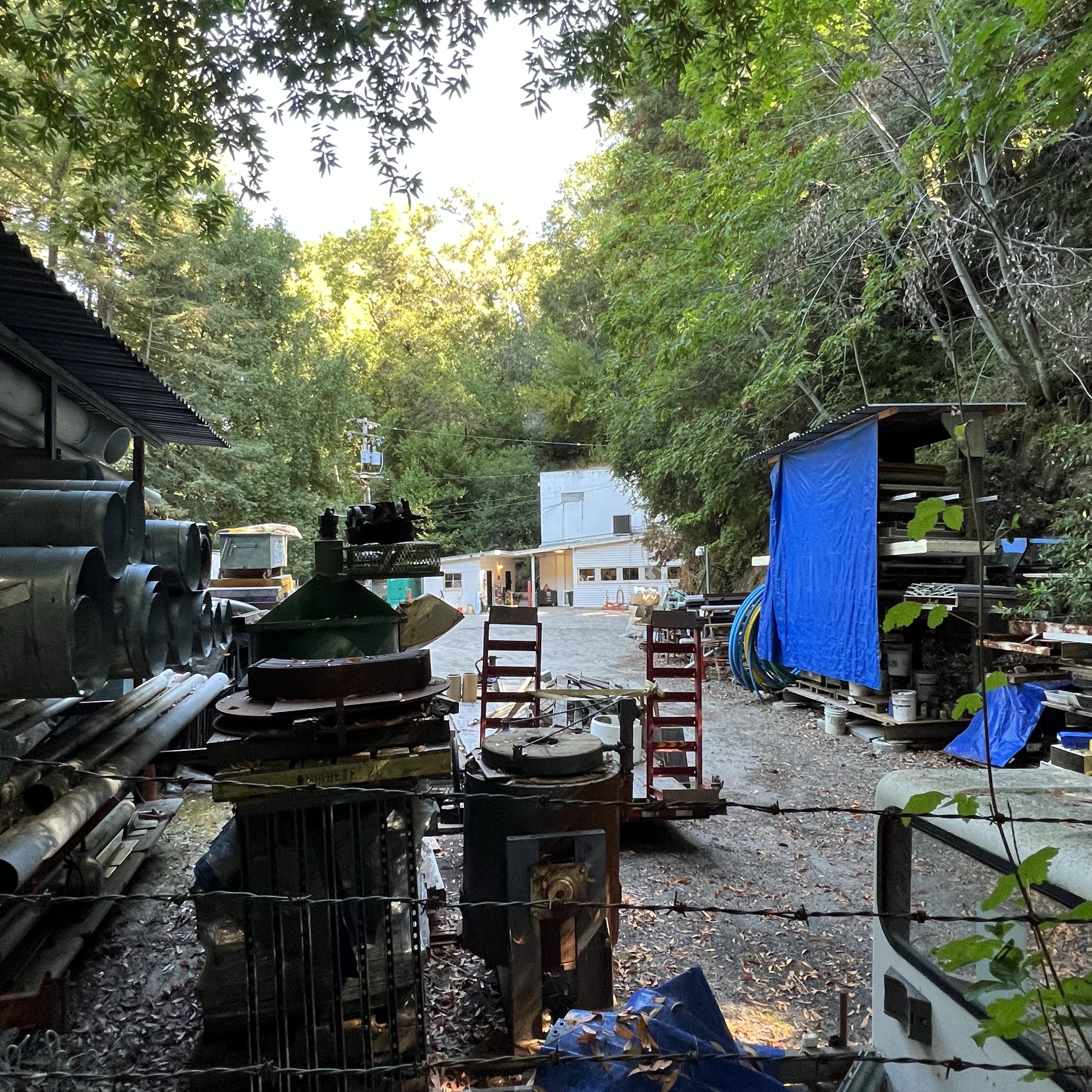 Peeping through the fencing toward the eastern portal of Tunnel No. 5. One of the two windowed buildings appears to be the guard shack. The parking lot now looks like an odd junk sale with junk that no one wants to buy!The former rail bed (sans rails) looking towards Eccles and Felton and Santa Cruz.