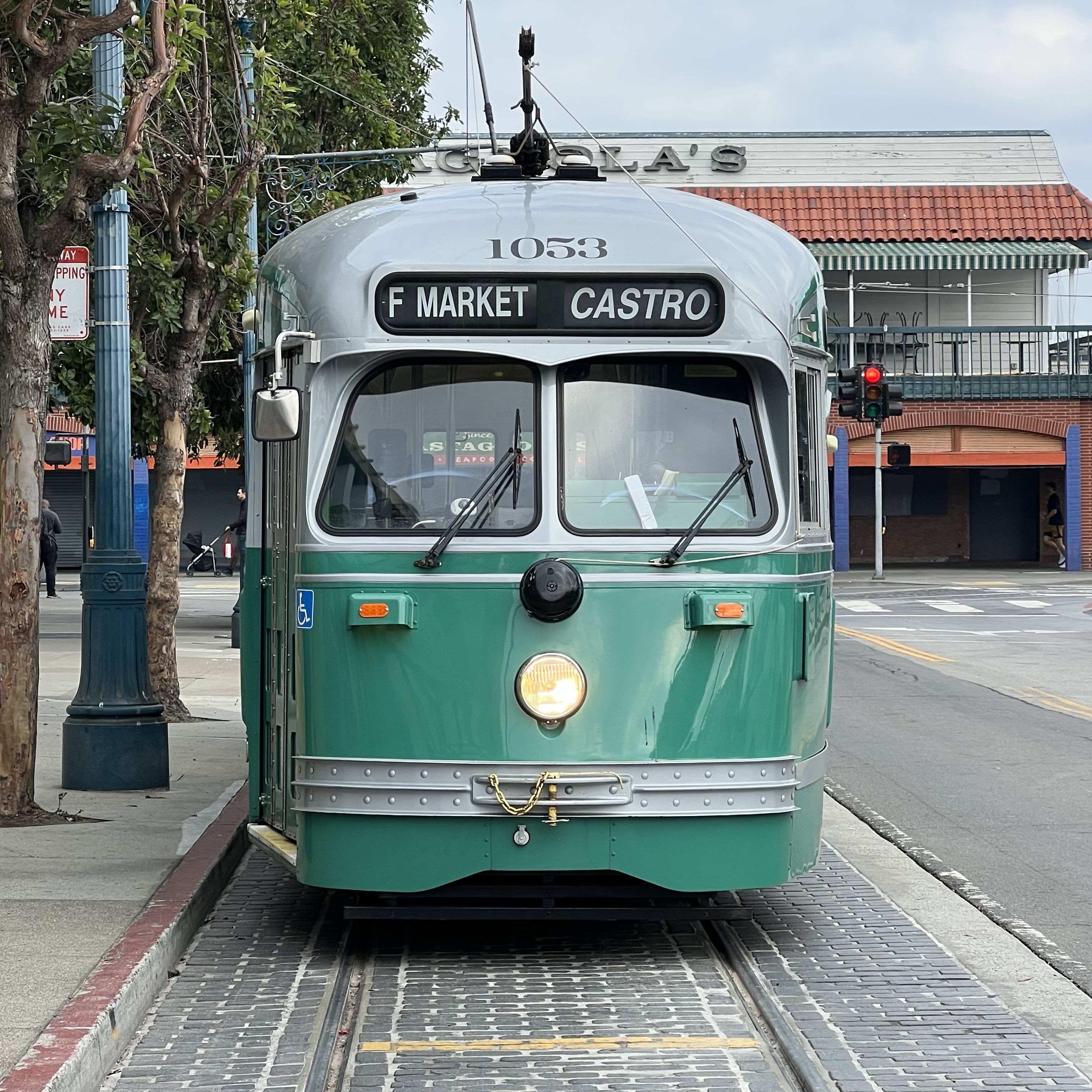 The most common vintage car seen on the F Market Line is a PCC (President’s Conference Committee) car. In this case No. 1053, painted in Brooklyn, New York livery, was built in 1947. MUNI has a fleet of 32 PCC cars.
