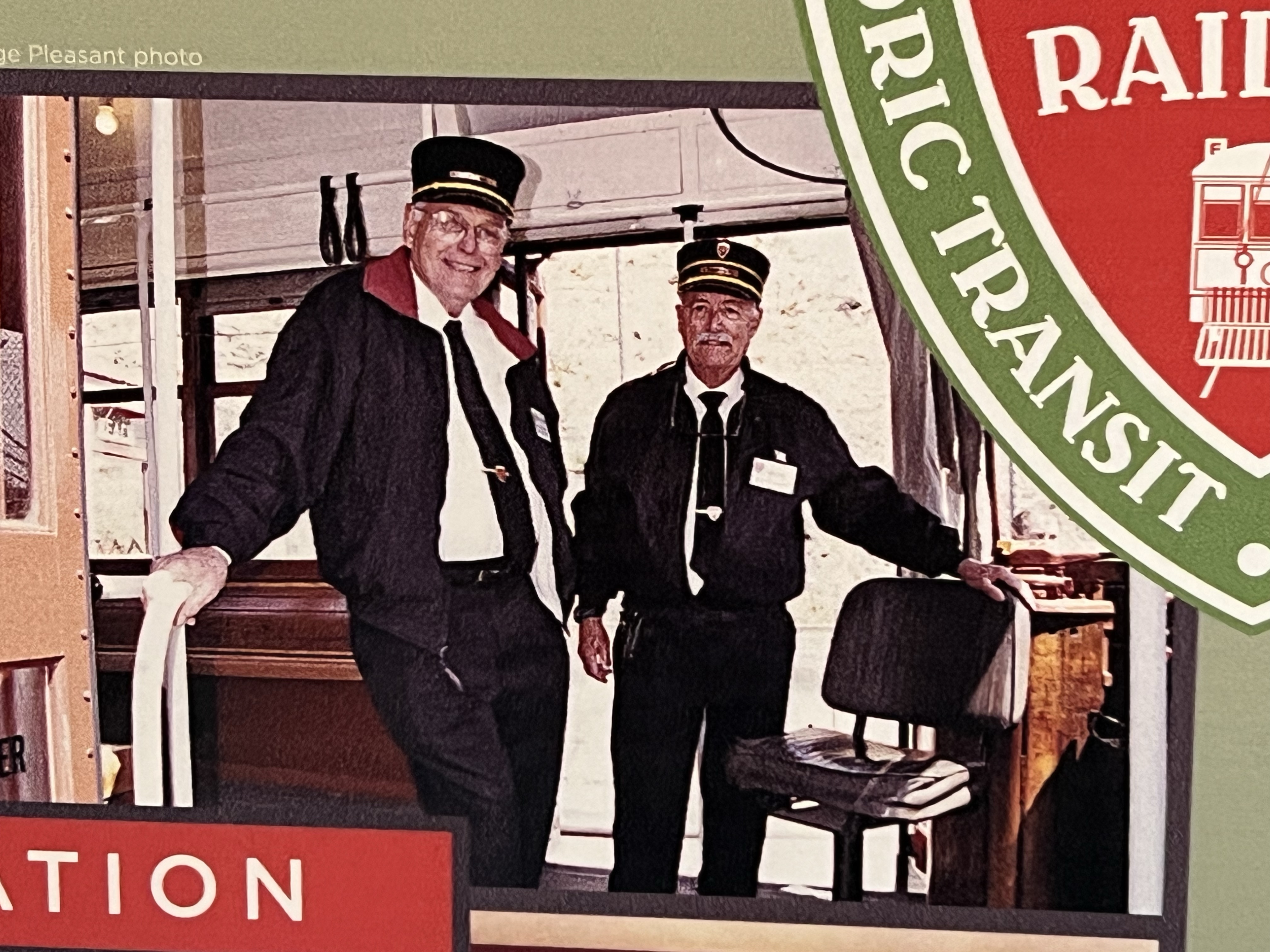 The picture of my dad at the museum is of him in later life aboard a streetcar. He is dressed up his motorman outfit. Standing to his right is his friend Walt, one of his lifelong friends he formed the youth rail group with. He must have been volunteering for some excursion. My dad is looking dapper in his black tie and Market Street Railway motorman’s cap (which I now have).