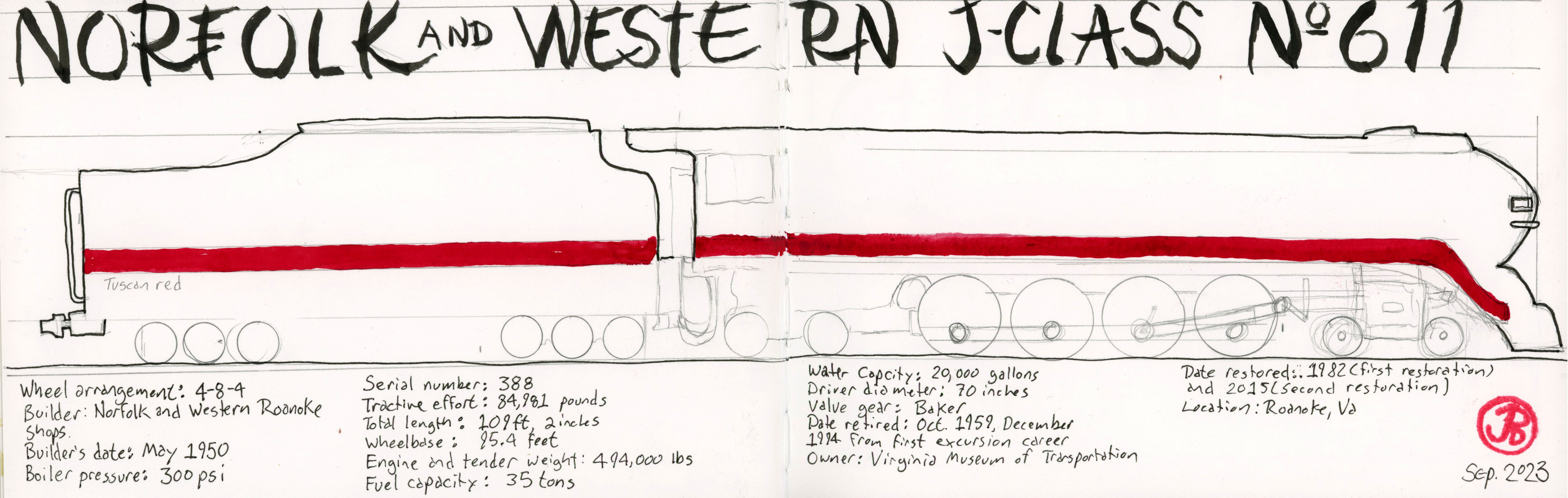 Before I headed east to take in this Queen of Steam, I did three illustrations of 611. One was my version of a stylized promotional period sketch (featured sketch), a realistic head on view (above), and a drawing design of the profile of 611 and tender with specs (below).