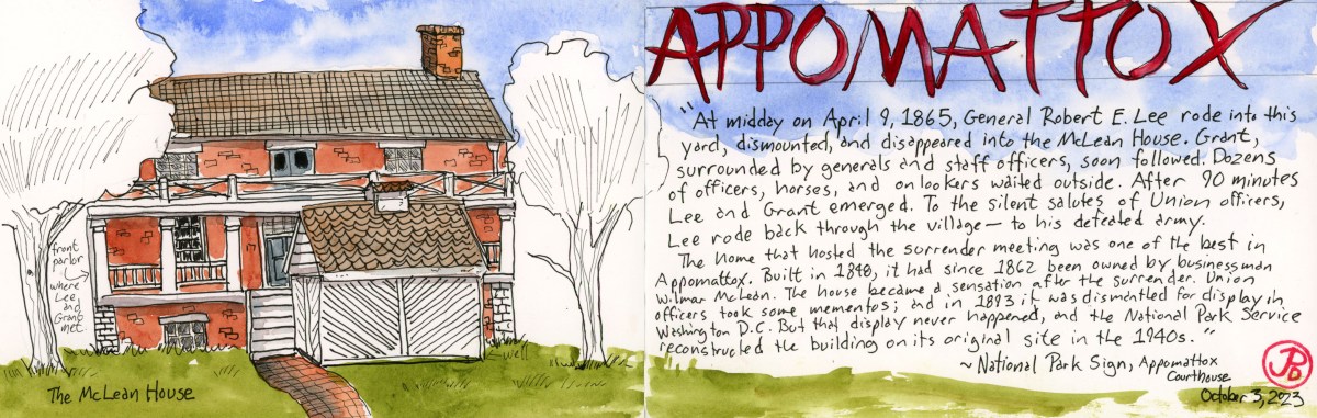 The countryside around Appomattox Courthouse is beautiful. The photo above is taken near the spot of Lee and Grant’s second meeting. The meeting occurred on the morning of April 10 with both men on horseback. While the surrender in McLean’s front parlor pertained to the Army of Northern Virginia, Grant tried to persuade Lee to convince the remaining Confederate forces to surrender. Lee refused telling Grant that the decision was up to the President of the Confederacy, Jefferson Davis.