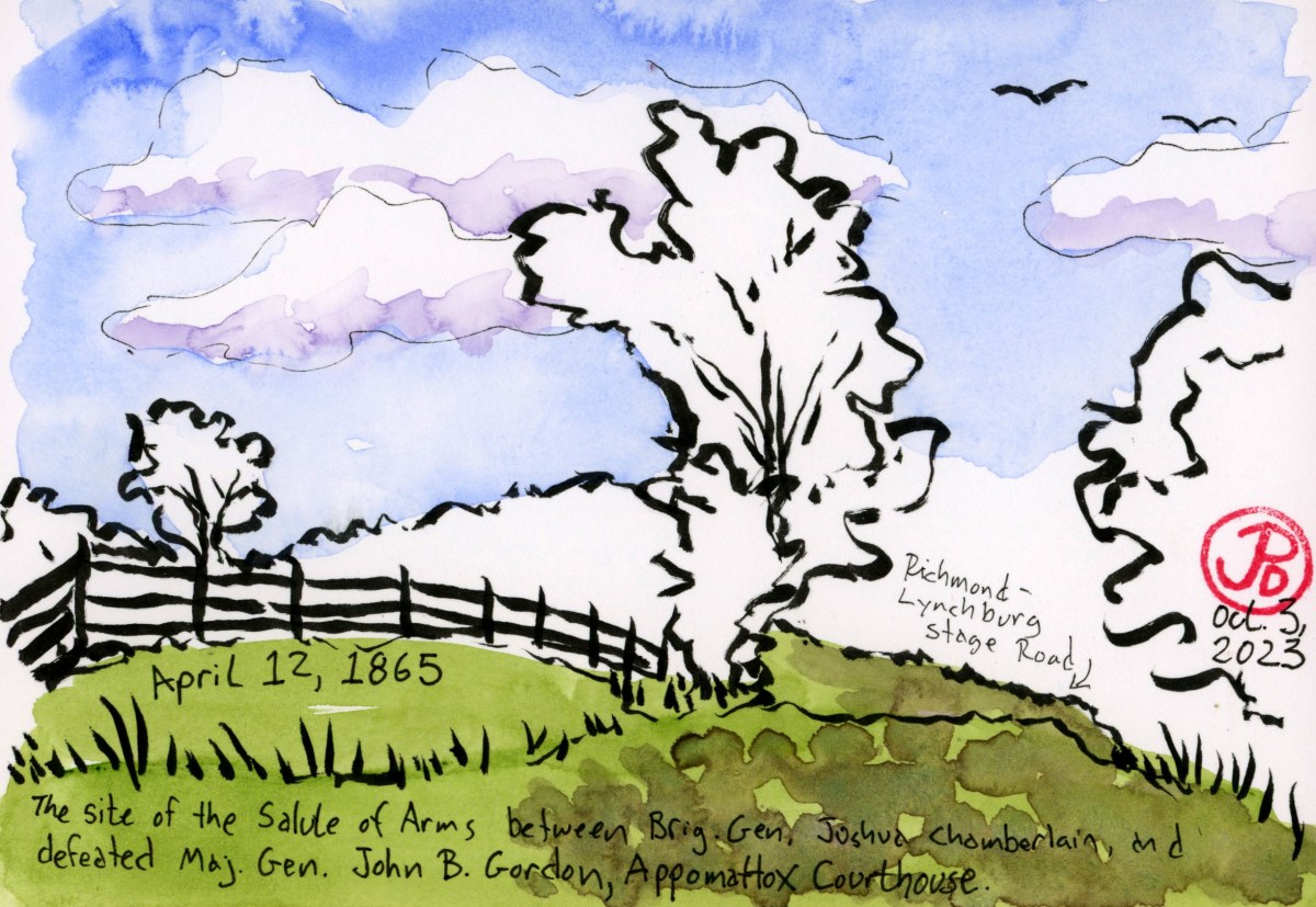 To the right of this photo and out of frame is the location of Chamberlain’s Salute of Honor. I sketched the view looking down the Richmond-Lynchburg State Road (featured sketch).
