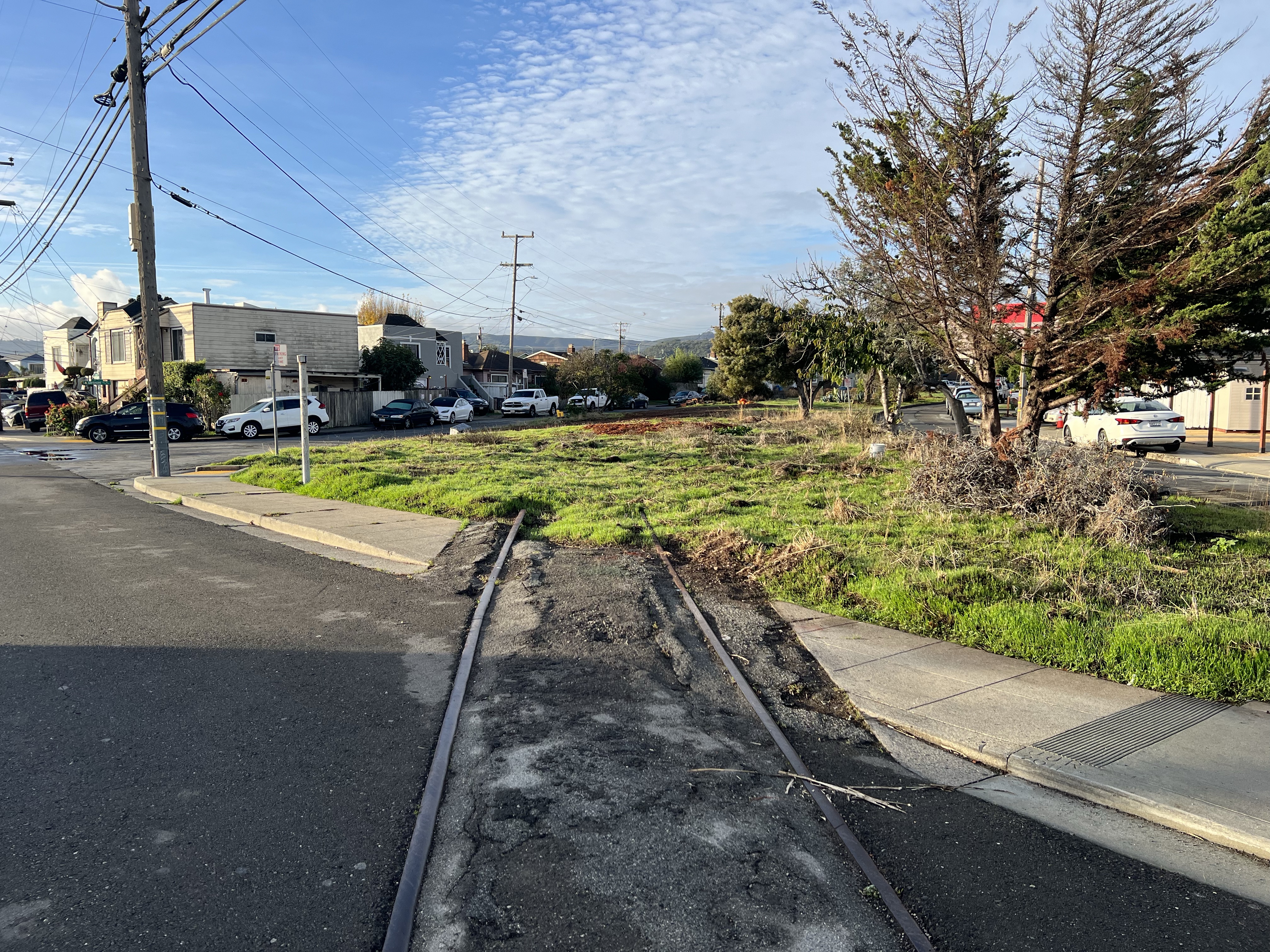 The former racetrack at Tanforan is bordered on one side by the former Southern Pacific mainline (currently used by the passenger service Caltrain).