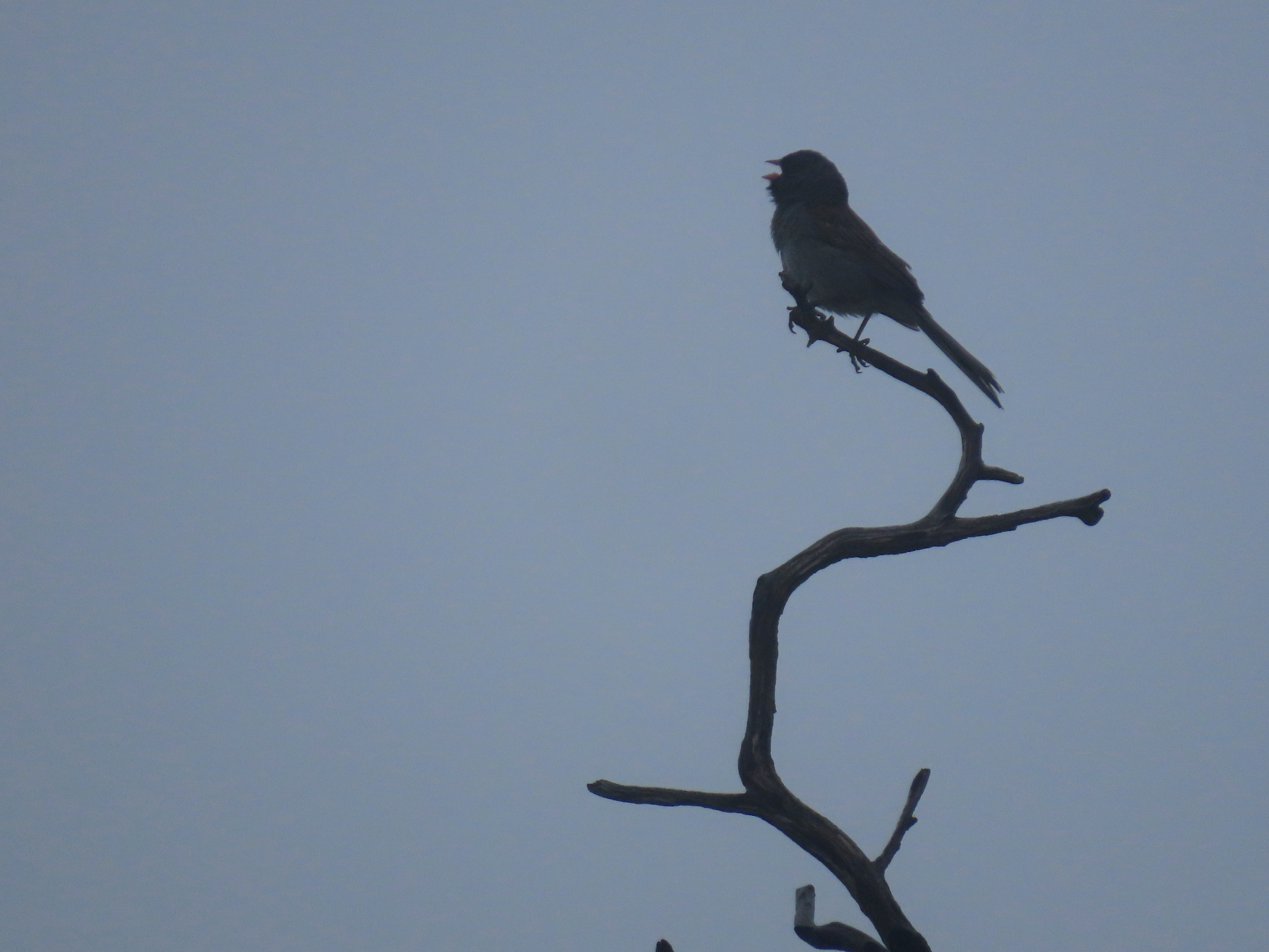 I willed the bird down by saying a little prayer to the Birding Gods and soon enough the sparrow flew over the road and landed downslope on a charred snag. Our binos swung up and we enjoyed prolonged views of a singing male black-chinned sparrow!