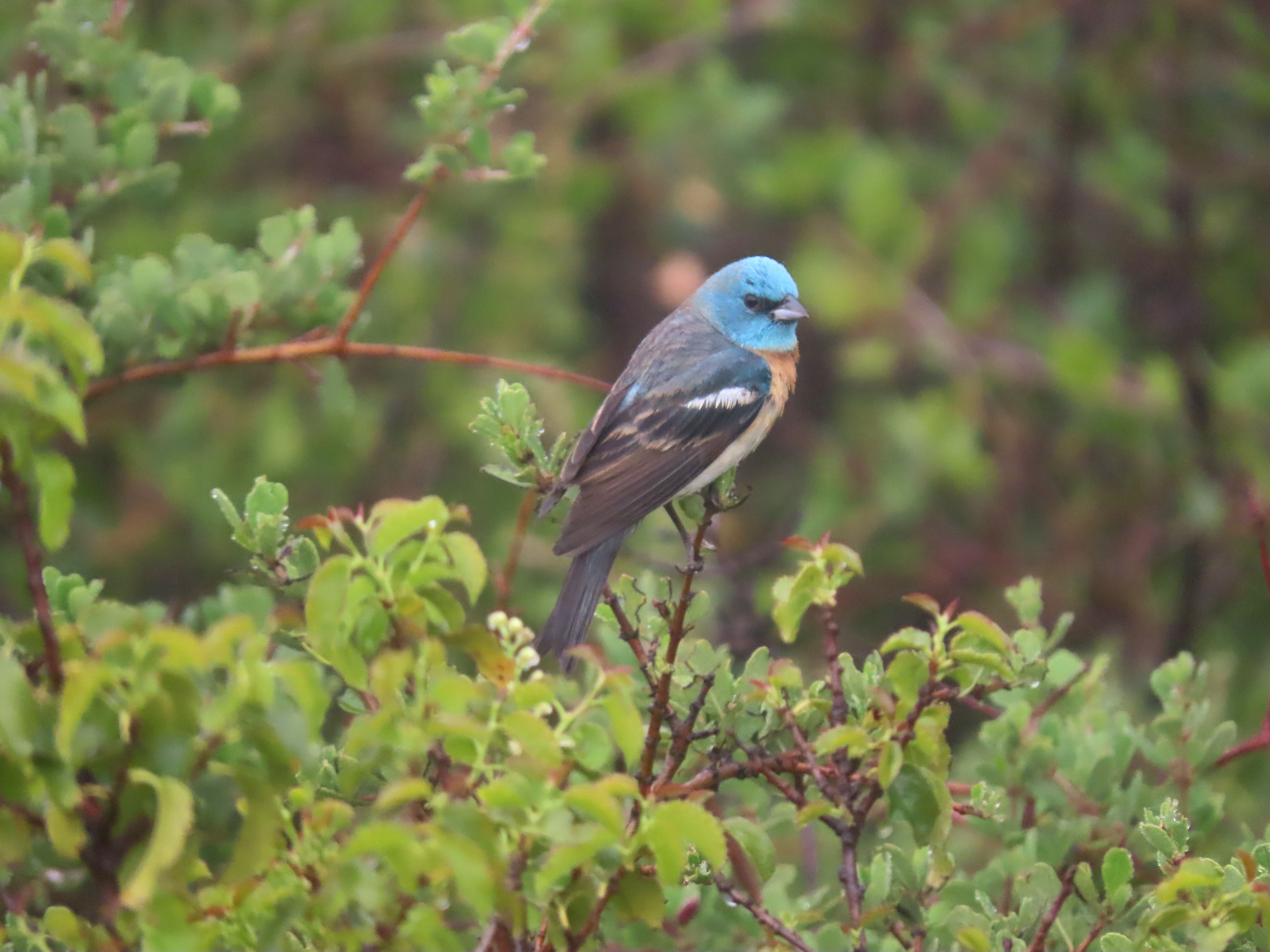 By this time we were coated with dizzily dampness and we headed back up to the parking lot. On the way up Grasshopper saw birds flying below the road. It was a pair of lazuli buntings! This is not a lifer for me or Grasshopper, but it has been a while since I have seen or heard this neotropic migrant.