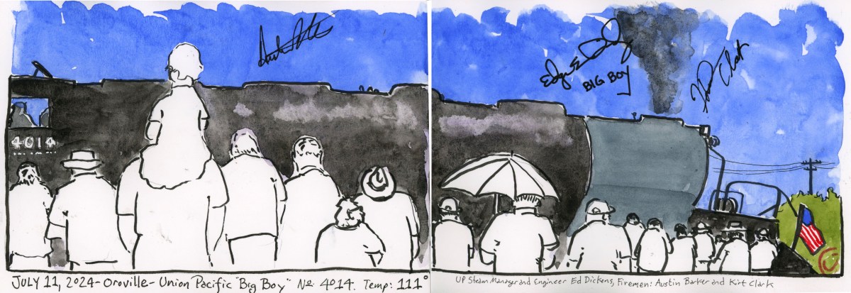 While 4014 was on public display in Roseville, two days later, I had Ed Dickens, engineer and head of Union Pacific’s Steam Program, sign my sketch. He wrote “Big Boy” under his name just as he does every morning on 4014’s smoke box.