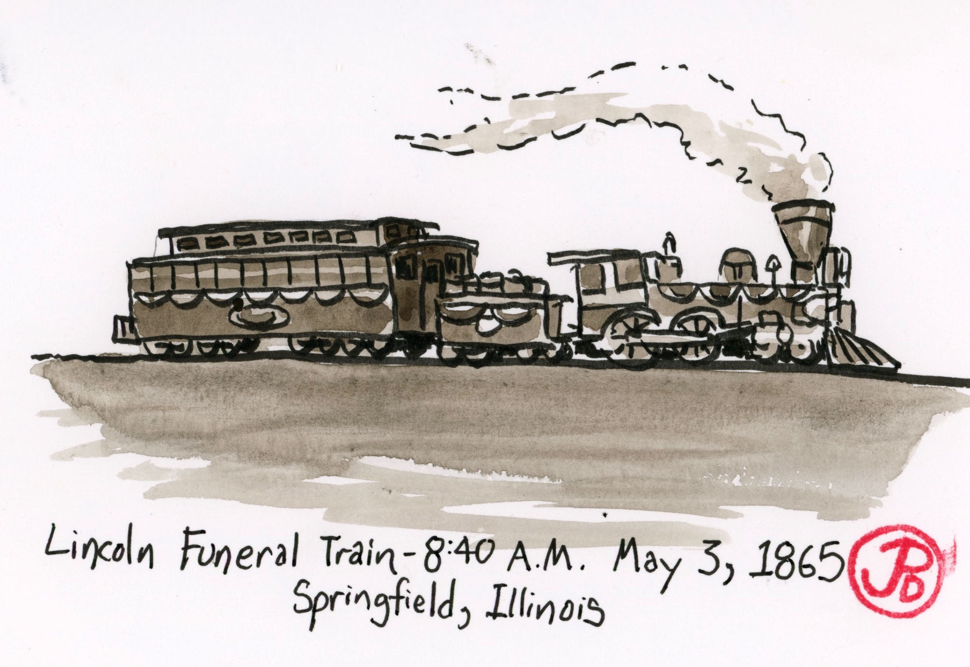 A detailed sketch of the funeral train from the monument at Springfield station. Passenger trains are still alive and well in Springfield. This is train 302 to Chicago’s Union Station with the State Capital in the background.