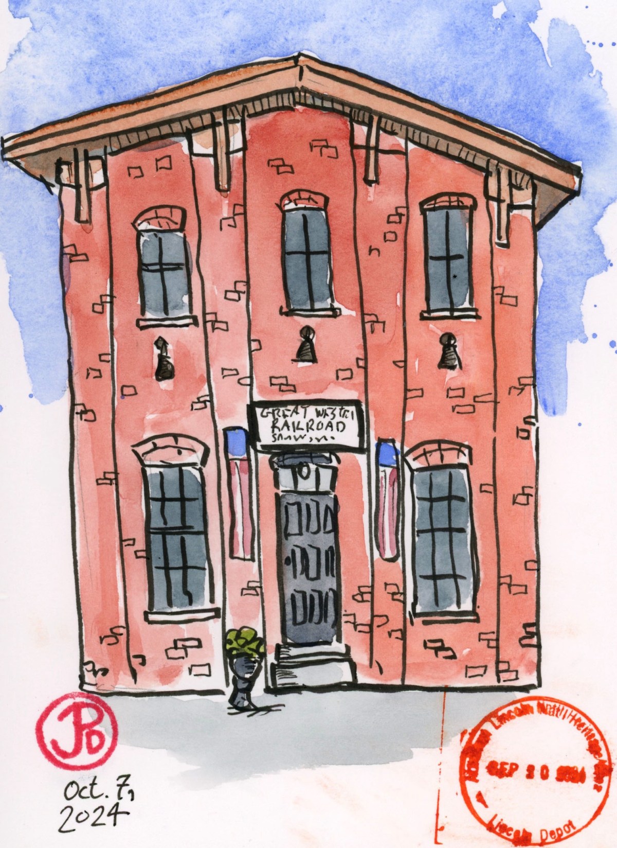 In circular inserts I illustrated four of my sketching targets: Lincoln’s house in Springfield, the Lincoln bust at his his tomb (visitors rub his nose for good luck), the National Museum of Transportation (featuring Southern Pacific’s No. 4460), and the Gateway Arch on the banks of the Mississippi in St. Louis.