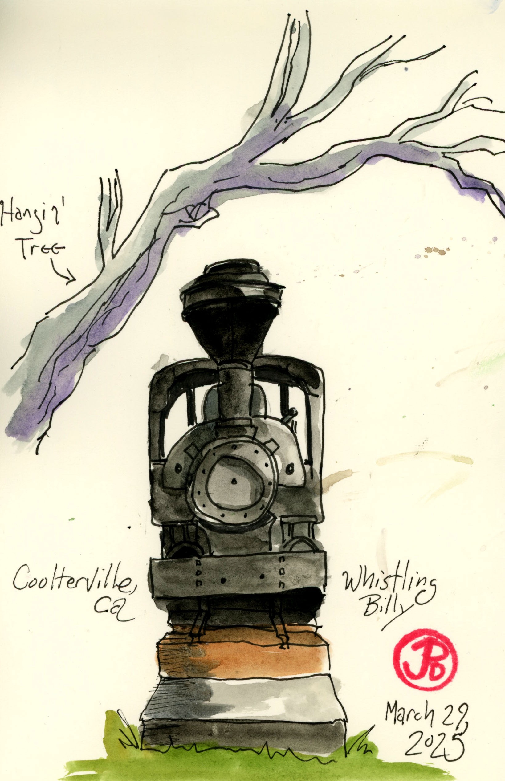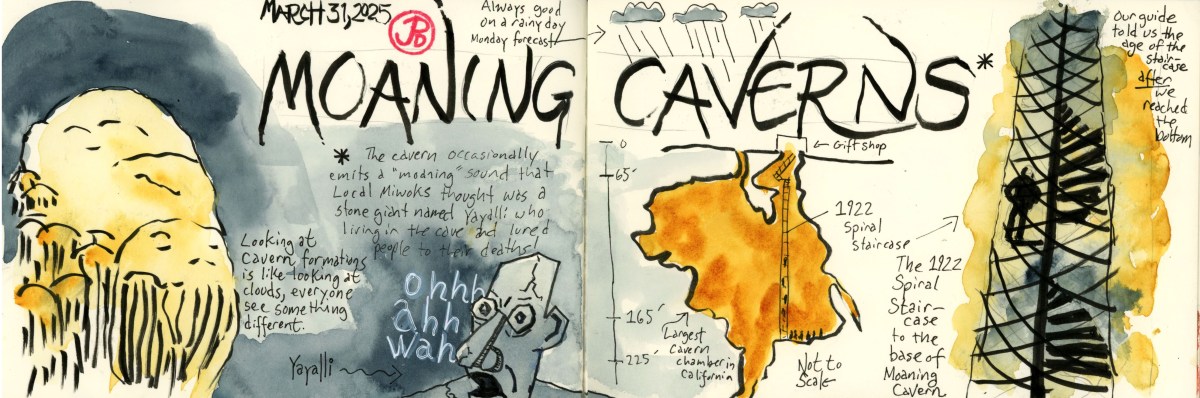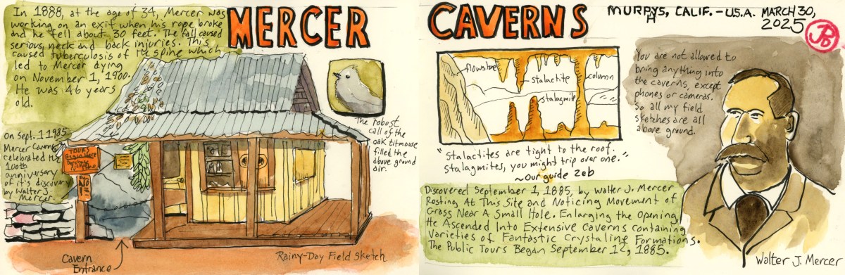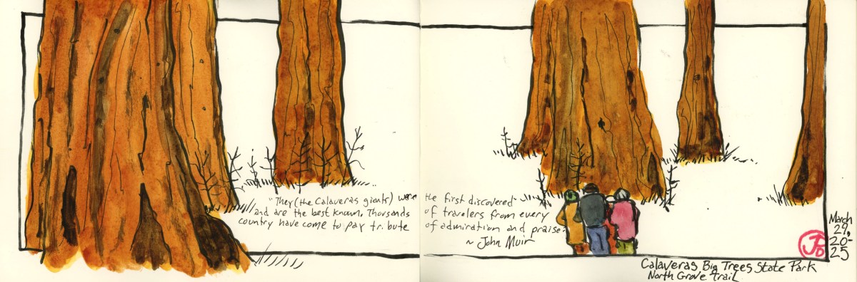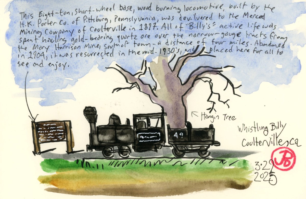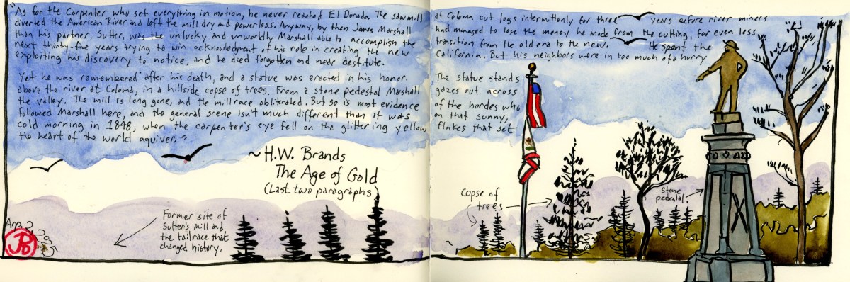 I envisioned a panoramic sketch with the monument on the right and I wanted to include two of my favorite paragraphs about Marshall and Coloma from H. R. Brand’s masterful account of California’s Gold Rush: The Age of Gold. The two paragraphs are the last two in the book. I love a book with a great ending. And this is a great book!
