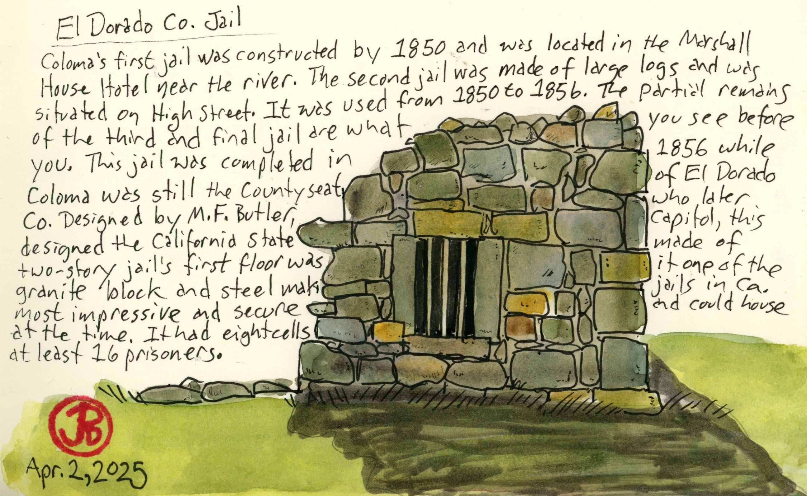 After sketching, I returned to the valley floor via the Monument Trail. I headed away from the growing crowds at the Gold Discovery Museum to sketch the jail ruins.