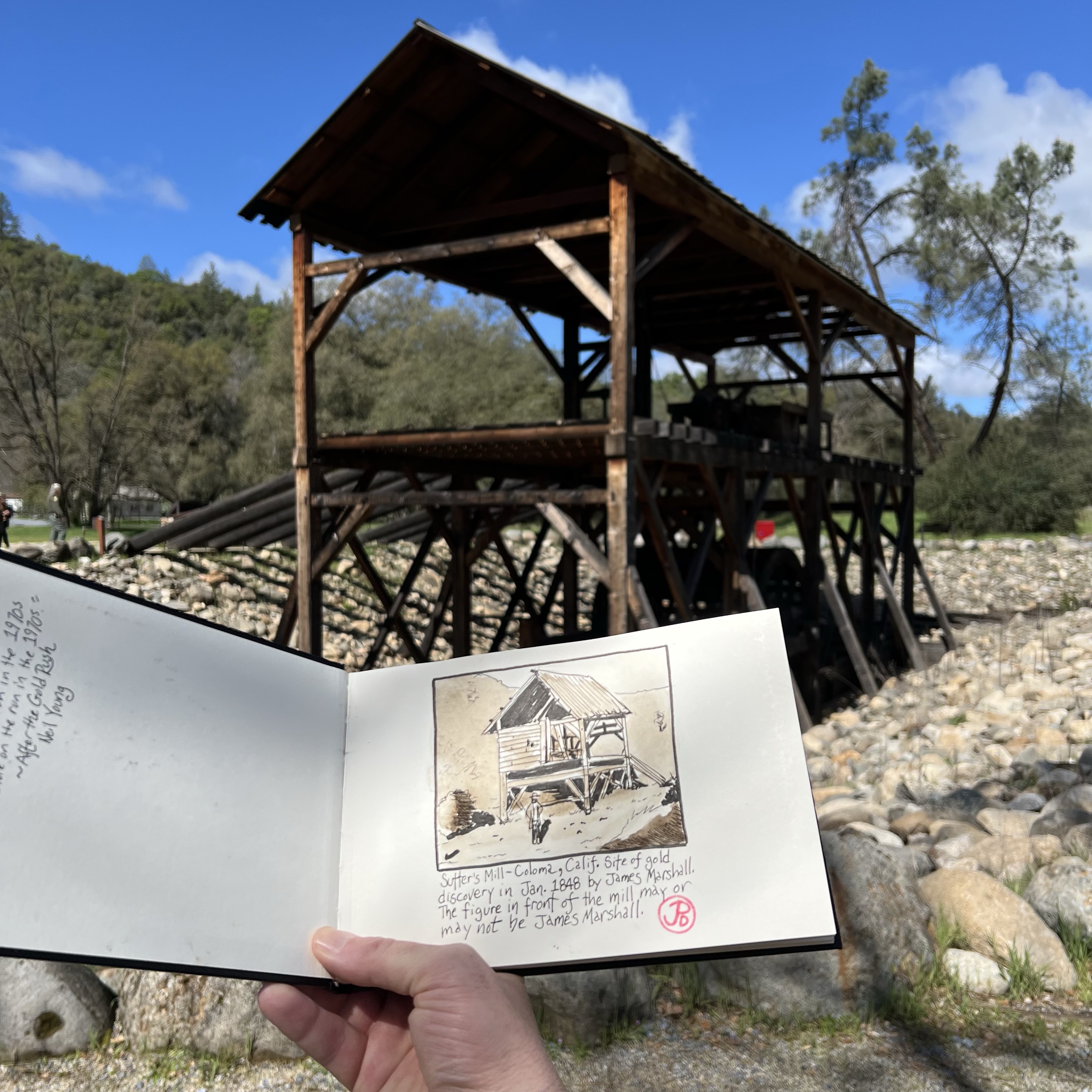 I envisioned a panoramic sketch with the monument on the right and I wanted to include two of my favorite paragraphs about Marshall and Coloma from H. R. Brand’s masterful account of California’s Gold Rush: The Age of Gold. The two paragraphs are the last two in the book. I love a book with a great ending. And this is a great book!