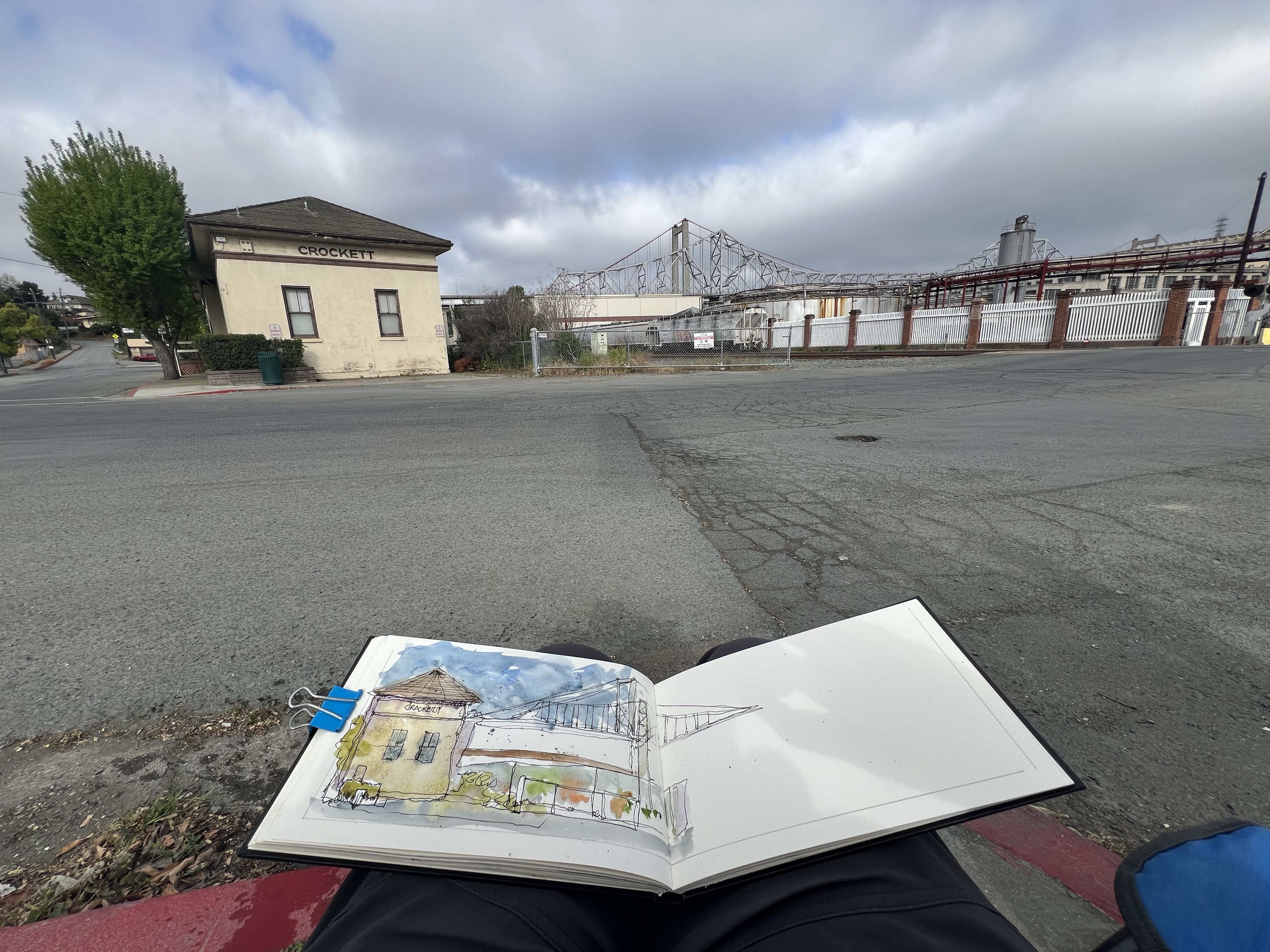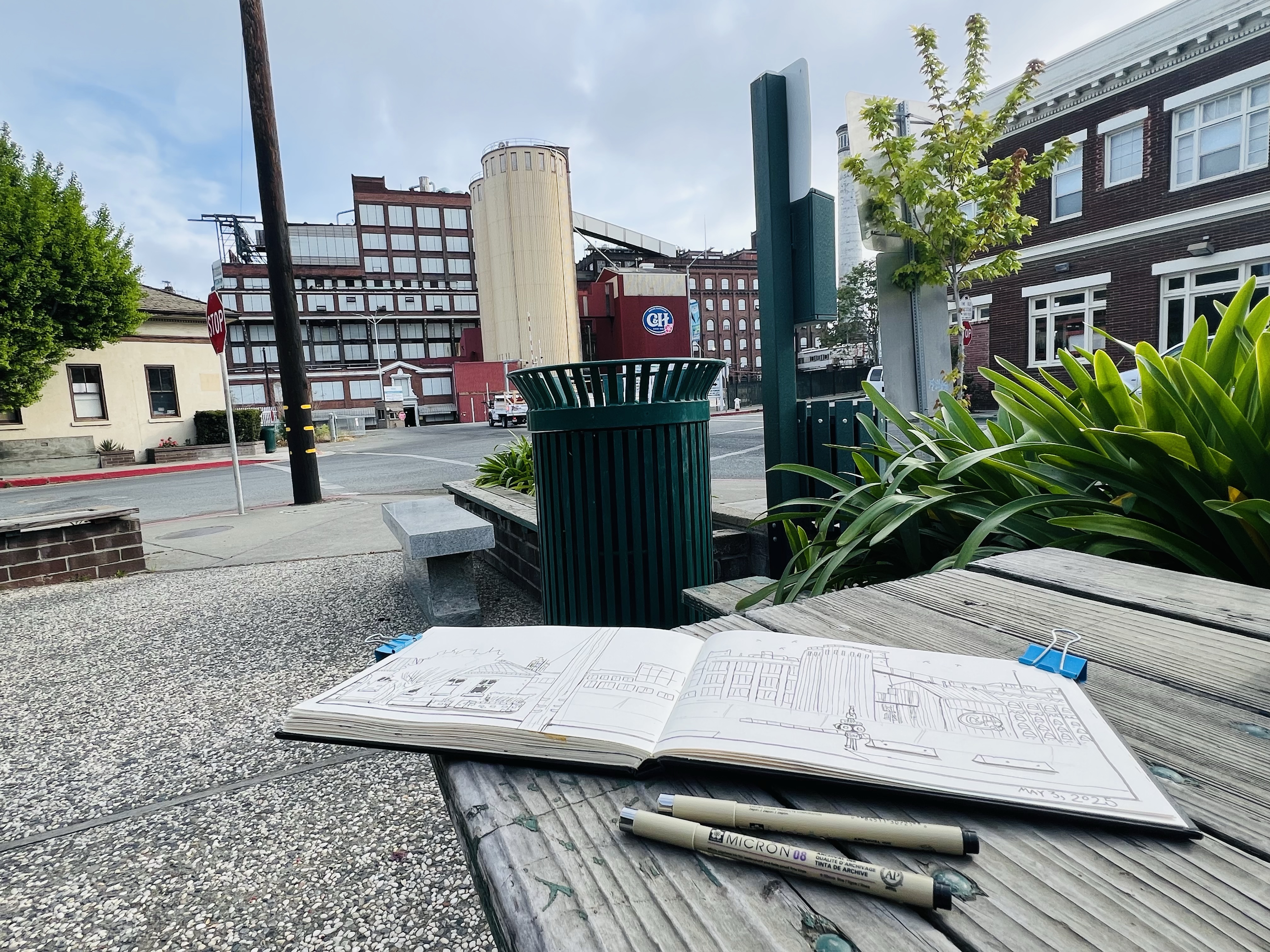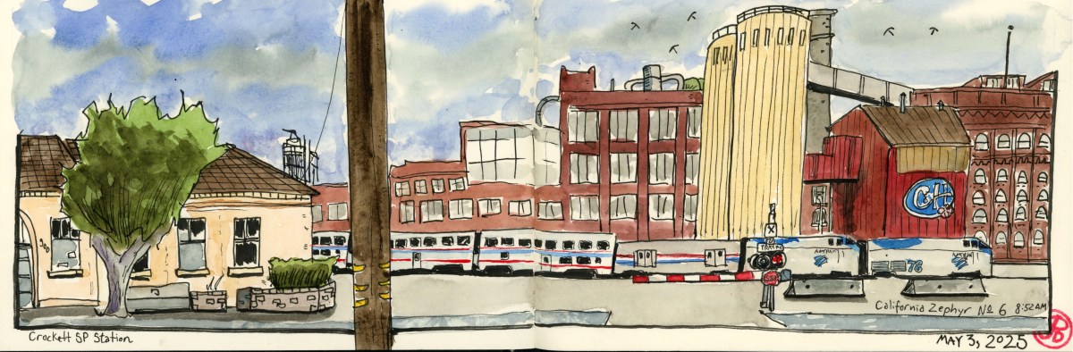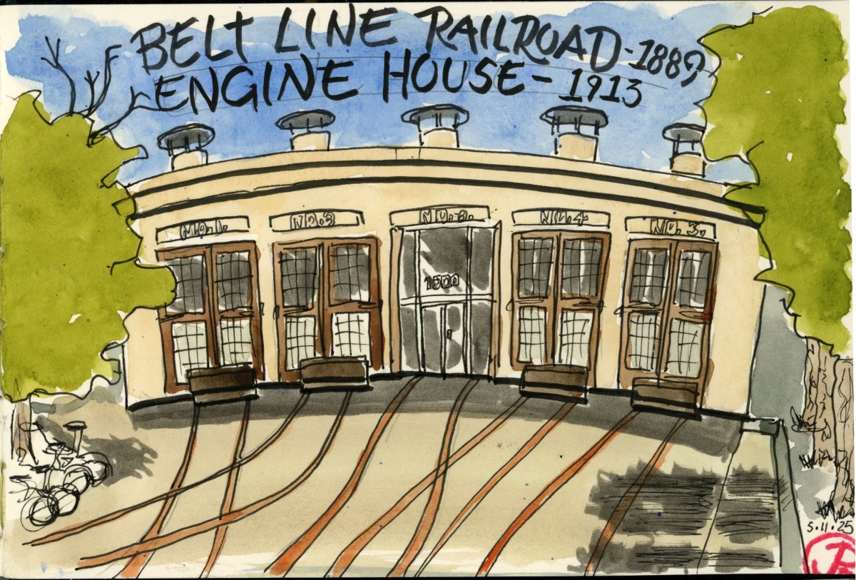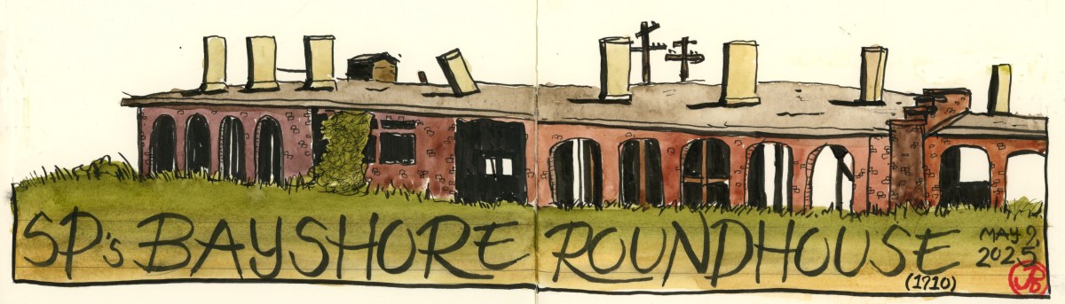 On Sunday I took the N Judah to Embarcadero Station with the intention of sketching a little San Francisco rail history. My main sketching target was the Belt Line Railroad Engine House or Roundhouse at Embarcadero and Sansome.