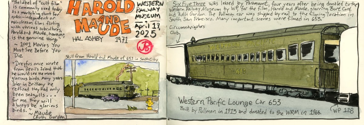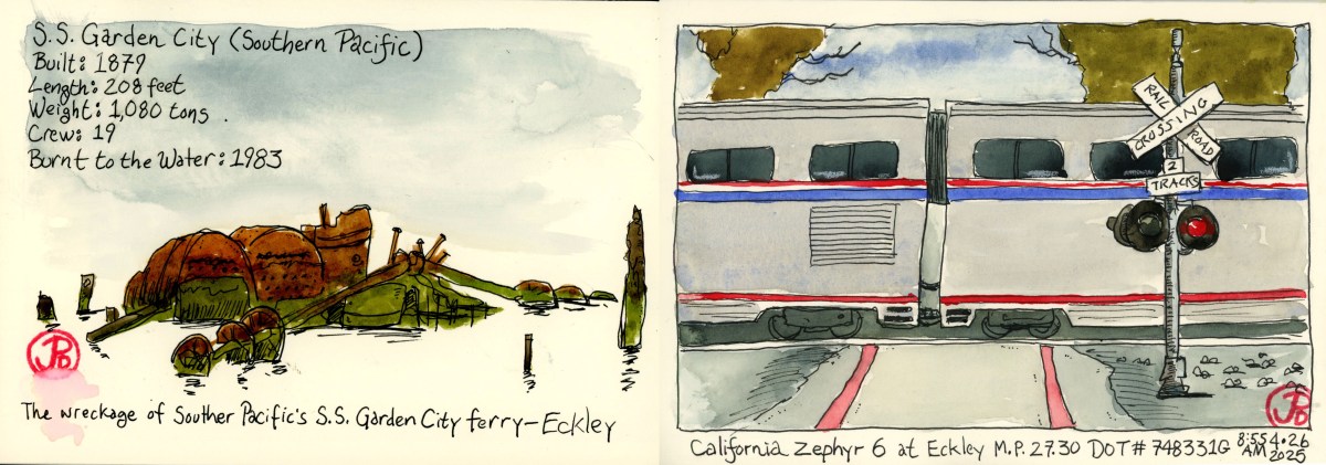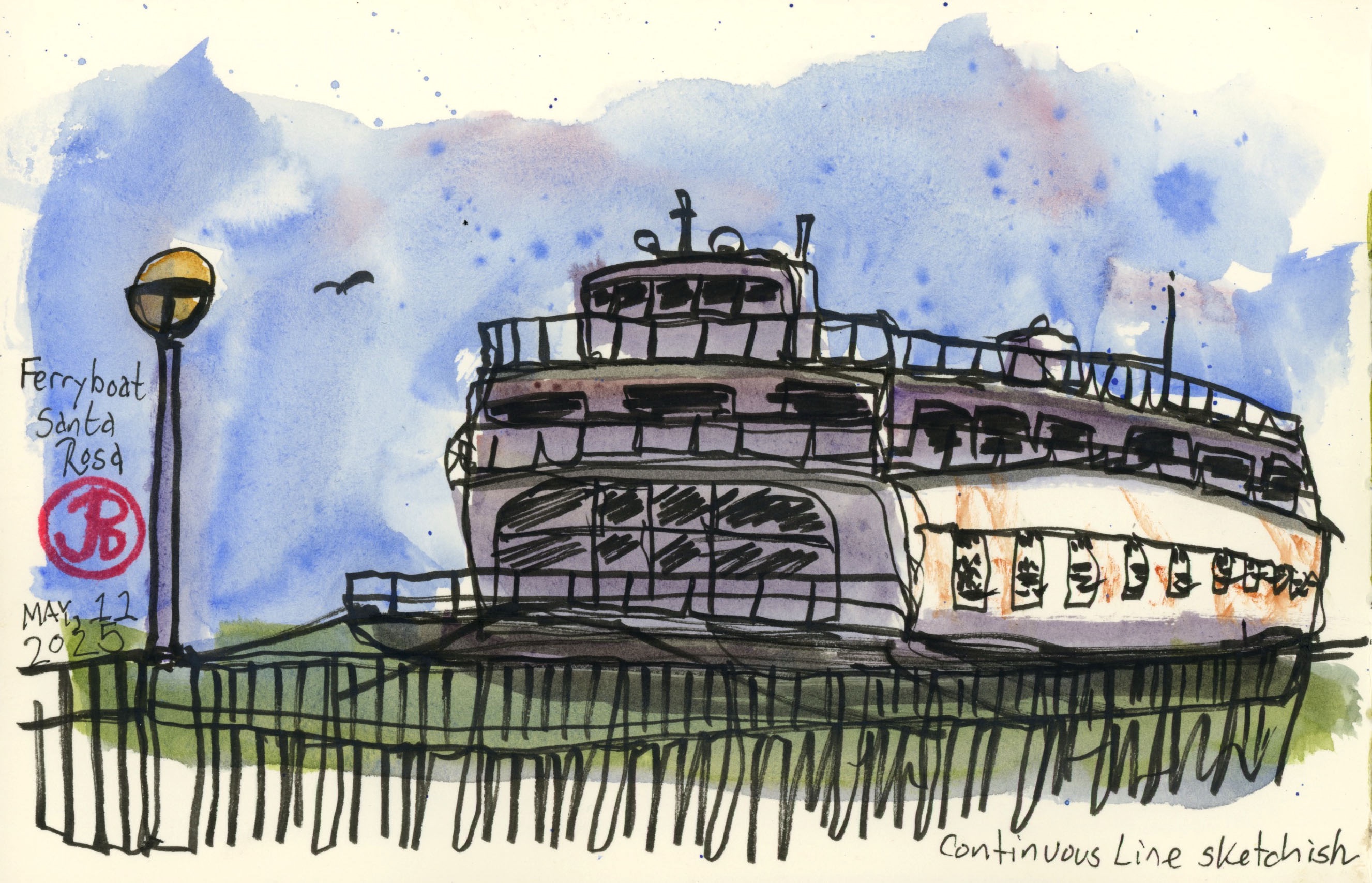On the walk from the Ferry Building I came upon the 1927 ferry Santa Rosa at Pier 3 and I thought I would head back after my roundhouse sketch to add this piece of rail and nautical history to my spread.