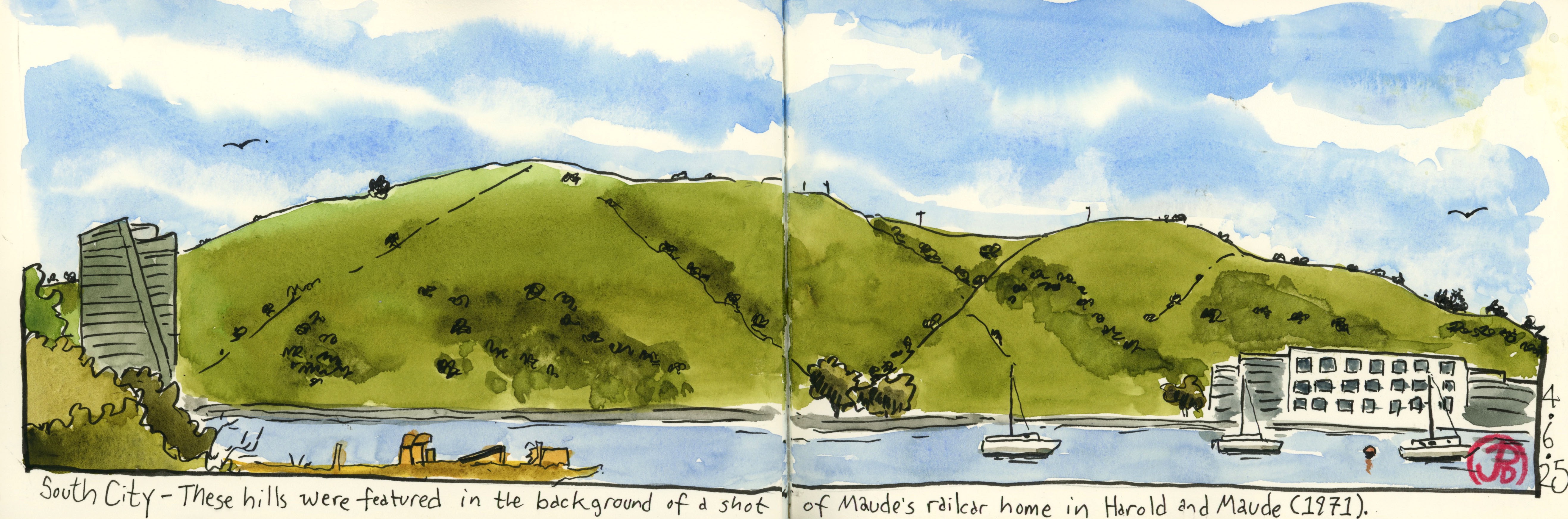 For this sketch I chose to keep it loose and render the ferry in a continuous line sketch. Although I did lift my pen a few times to add some details and shading. So I’ll call it a broken line continuous sketch. For this sketch I experimented with a thicker more expressive pen, my Faber-Castell FM (Fude Medium). I love sketching with this pen!