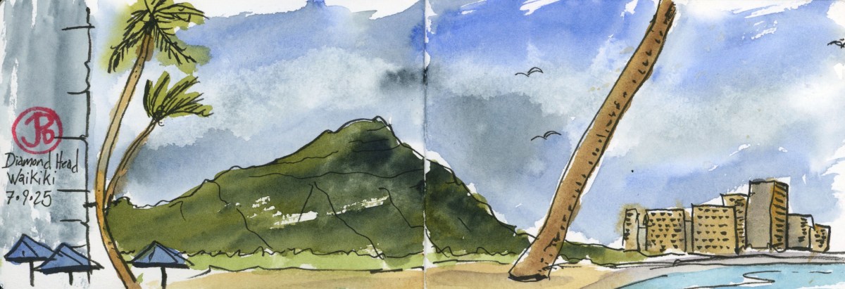 I finally made it out to Waikiki Beach with stunning views of Diamond Head. So I had to sketch the view (featured sketch). With some sand in my shoes and a Mai Tai in my gullet!