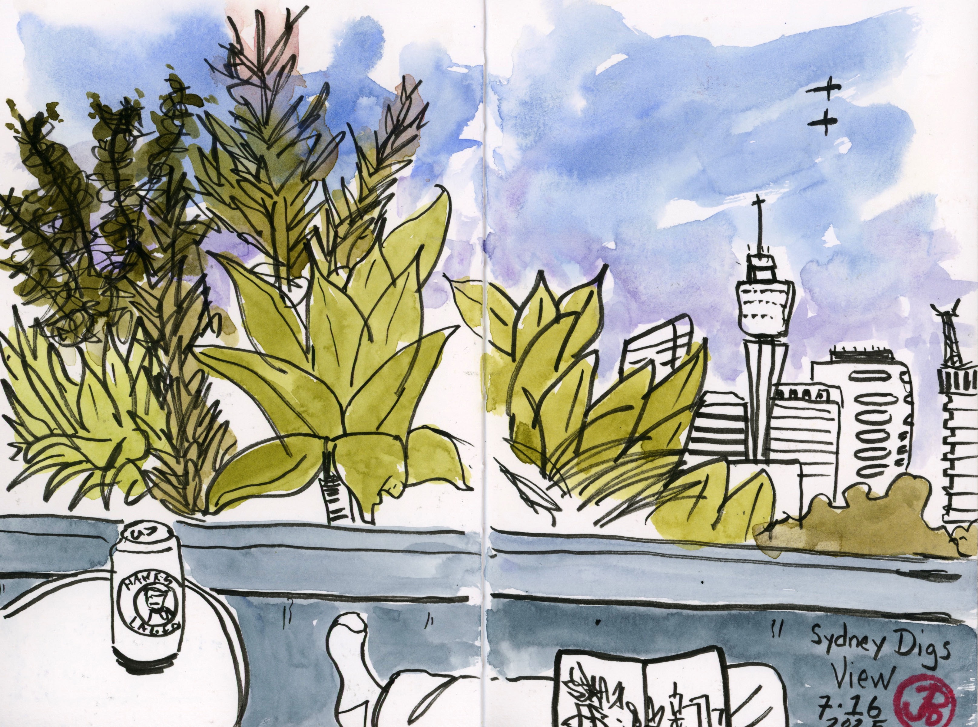 My sketching bench with a view of two of Sydney’s most iconic structures produced the featured sketch. A self portrait view from the deck of my Surry Hills fifth floor flat looking toward downtown Sydney. A frequent morning visitor to the trees in the foreground and my first Aussie lifer was the beautiful rainbow lorikeet.