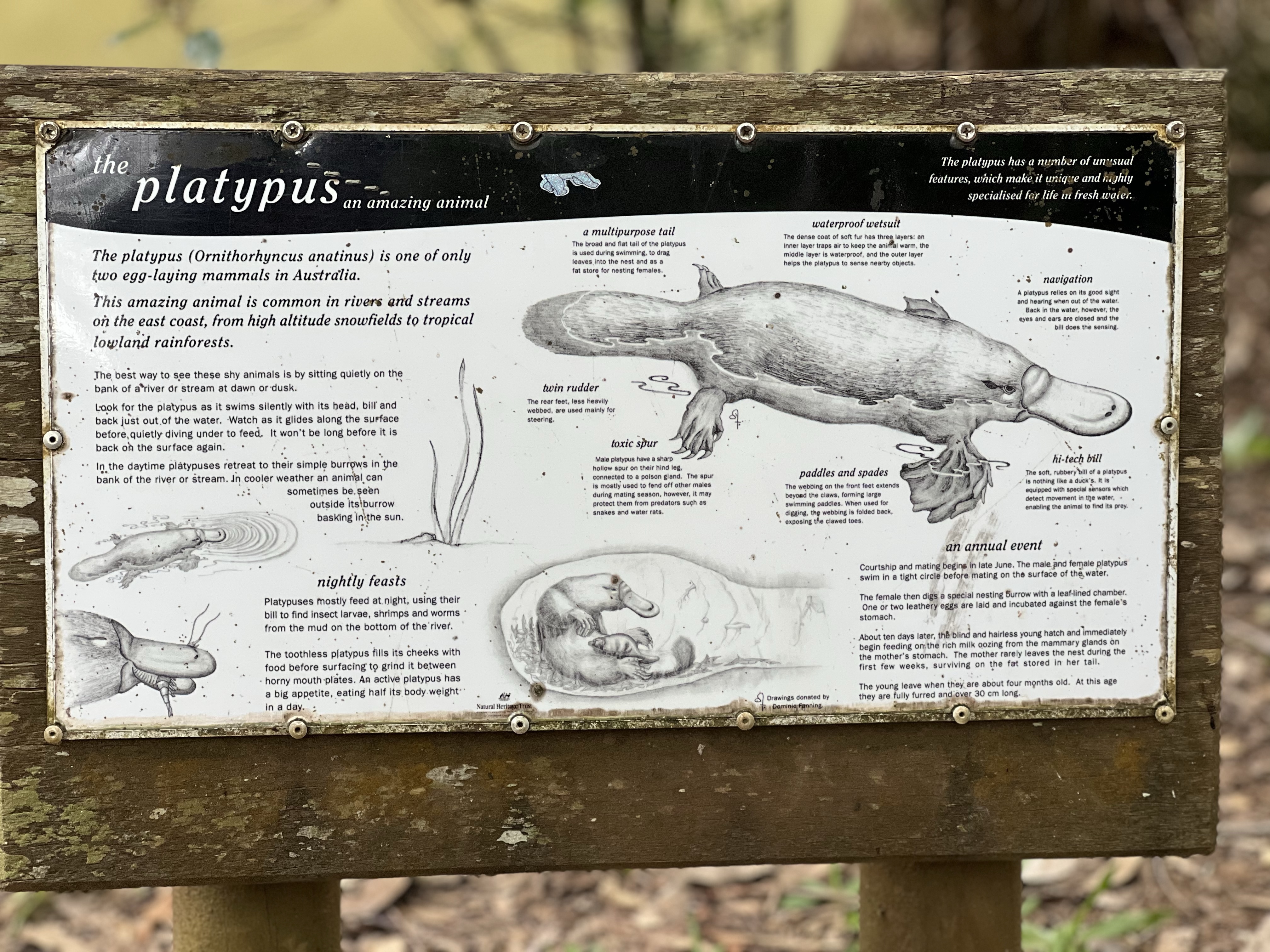Now platypus lore says that the best time to see this aquatic mammal is at dawn and dusk. So why were we at the bank of the creek in early afternoon? According to our guide, we had a good chance of seeing platypus on this stretch of creek at any time of day. Platypus spend a lot of the hours of the day foraging for food. And that is the best time to see them.