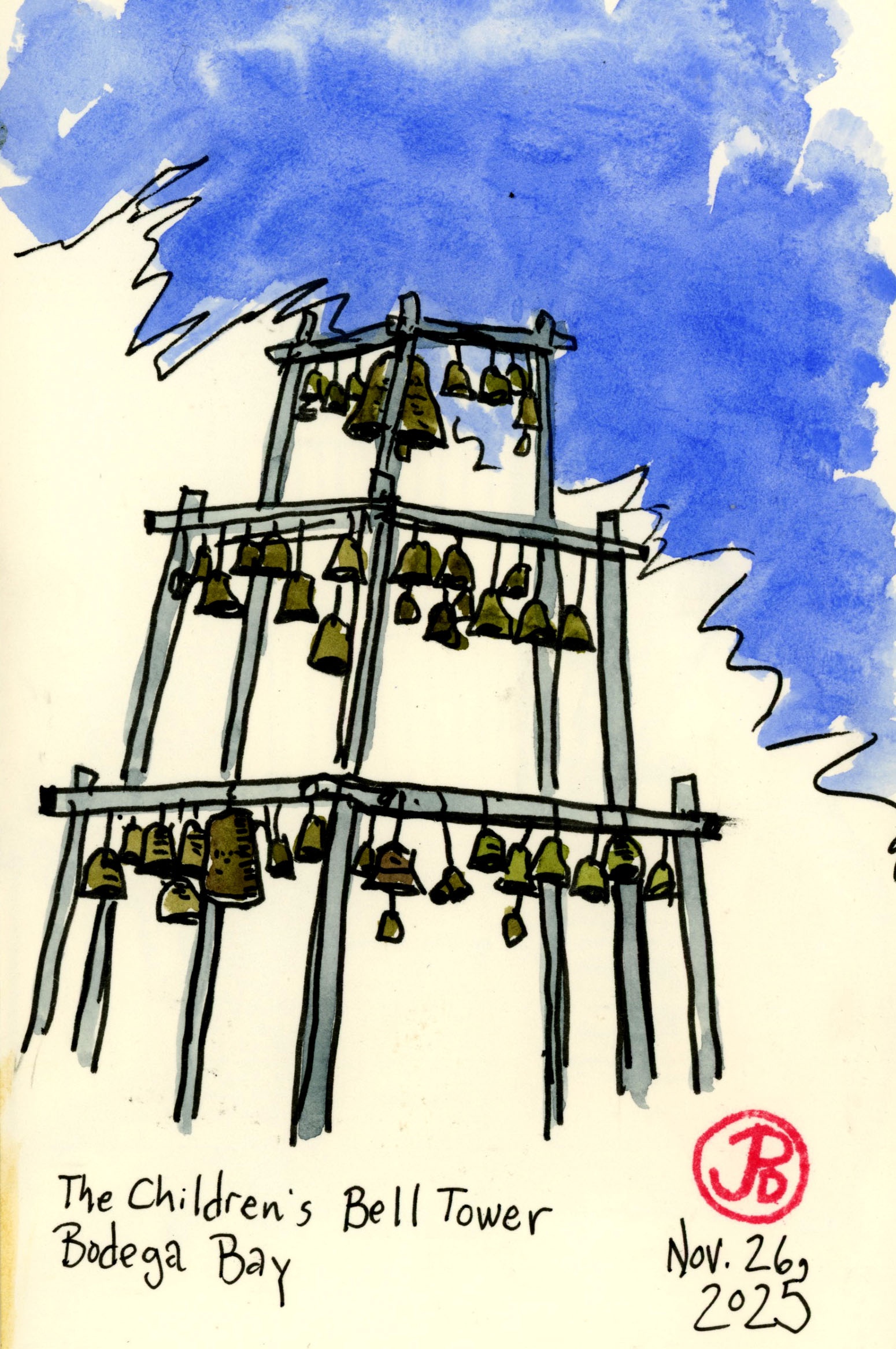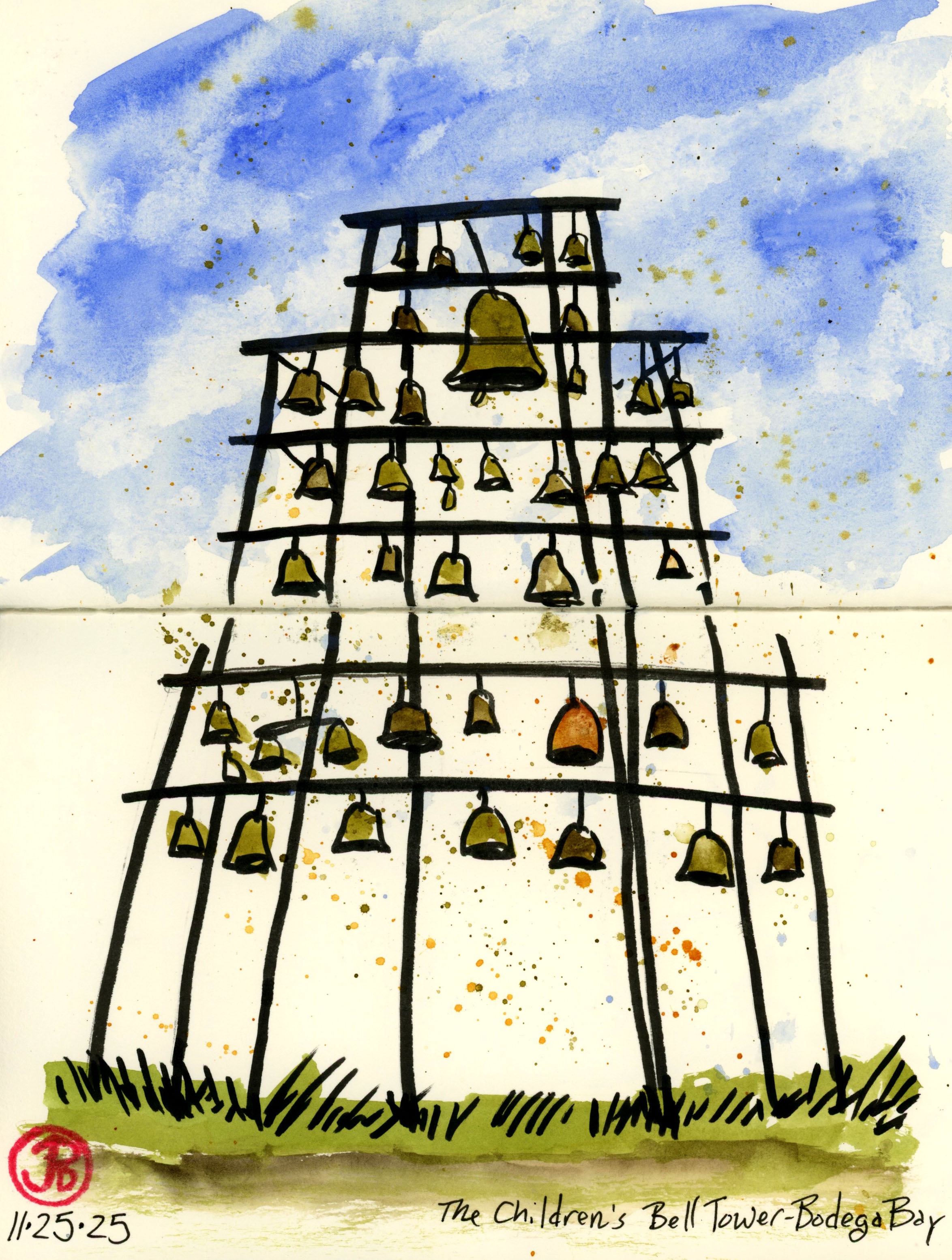 Spending time eight miles north of Bodega Bay meant that I could explore and sketch subjects off the beaten path (Highway One). I had been to BB many times but I had never heard of the Children’s Bell Tower. Being an educator I wanted to learn more about it.