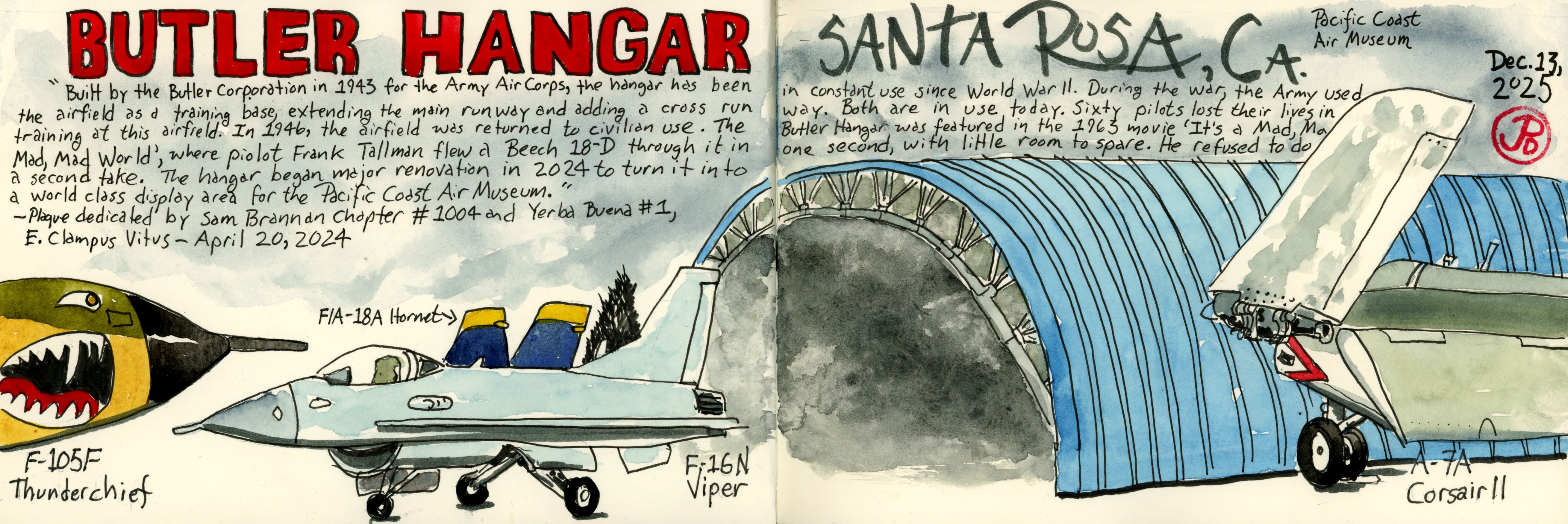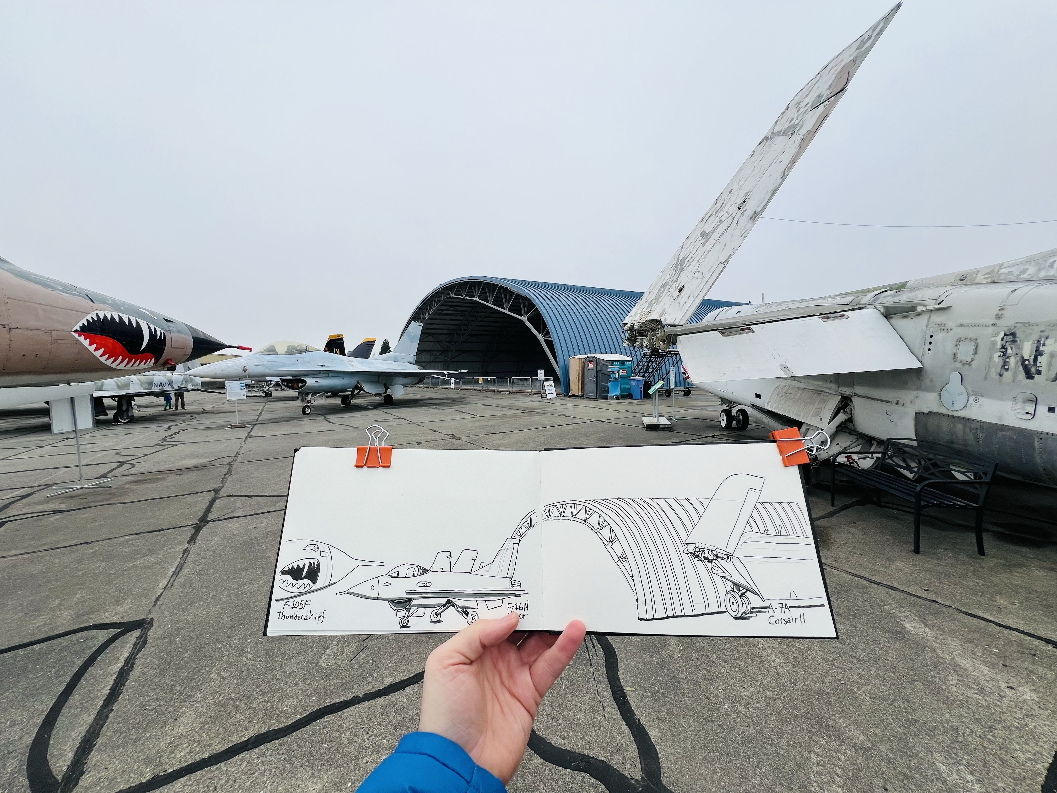 Field sketching at the airfield at the Pacific Coast Air Museum. My sketching backrest was an auxiliary fuel tank from a F-105F Thunderchief.