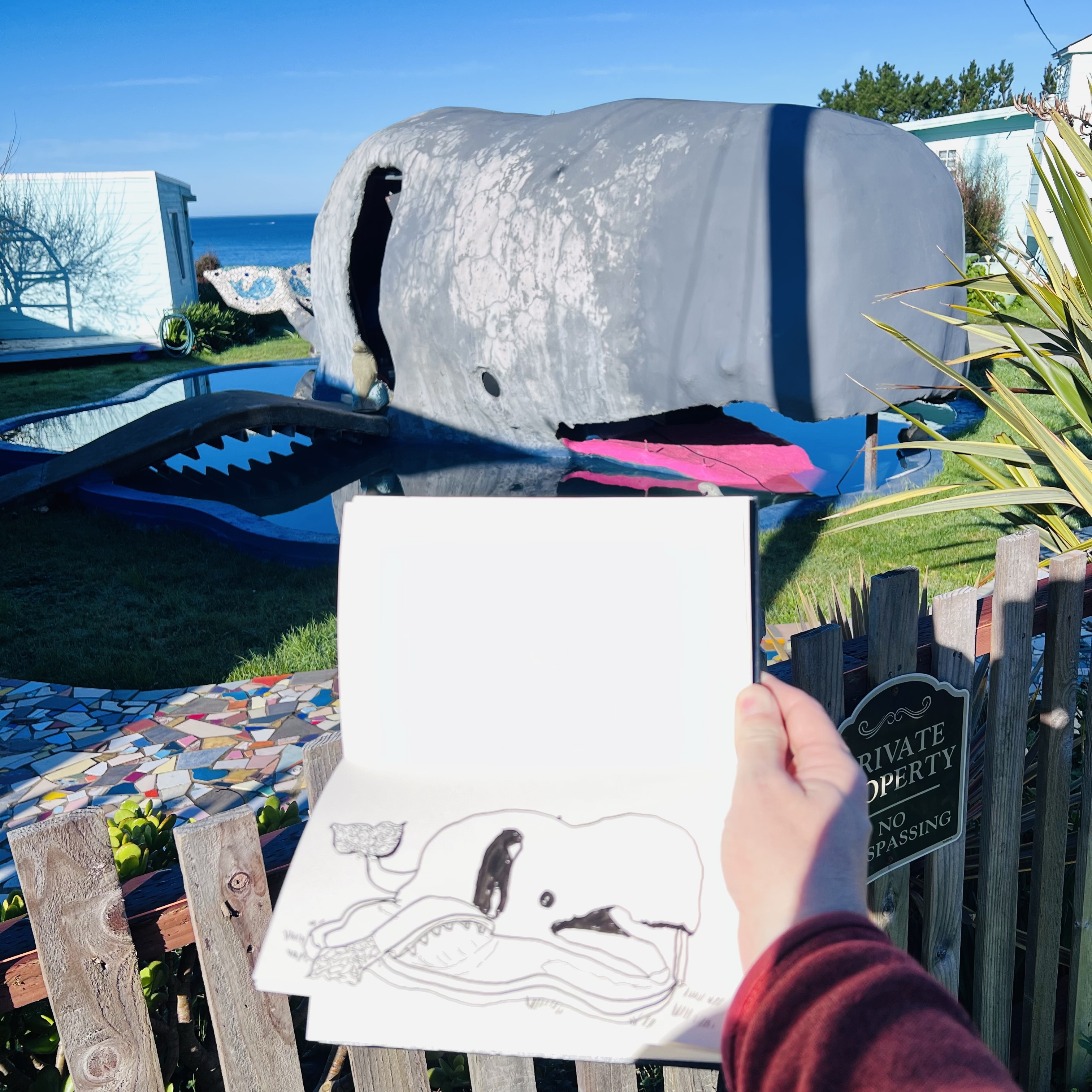 If you build a whale, they will come. At least that’s what I think the sculpture/creator thought and I did come to sketch it. At onetime you could enter the belly of the whale and recline and watch television. Now it seemed closed to the public with a sign on the white picket fence warning of the Dalmatian. I didn’t see the Dalmatian, so I guessed I would be safe.