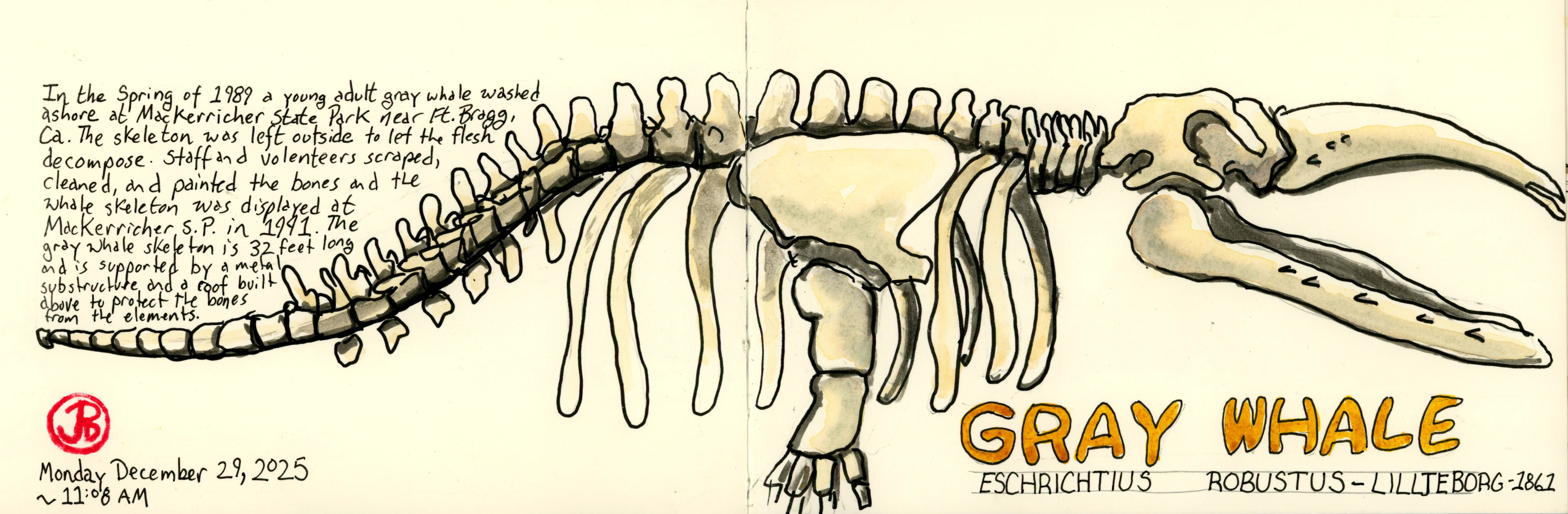 Near the visitors center is a collection of whale bones. The 32 foot gray whale skeleton was what caught my sketcher’s eye.