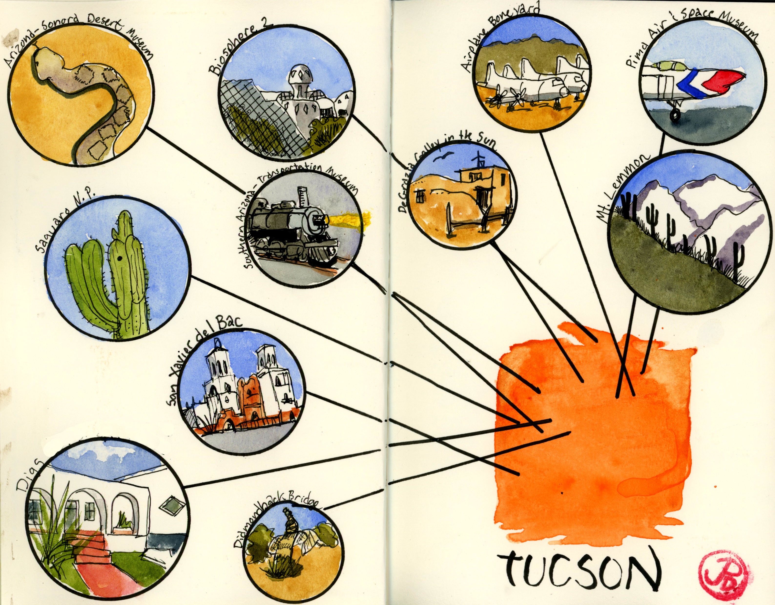 Another spread includes some sketching targets in and around Tucson including Mt. Lemmon, Saguaro National Park, the Pima Air & Space Museum, the Airplane Boneyard, the Southern Arizona Transportation Museum, the Arizona-Sonora Desert Museum, and others.
