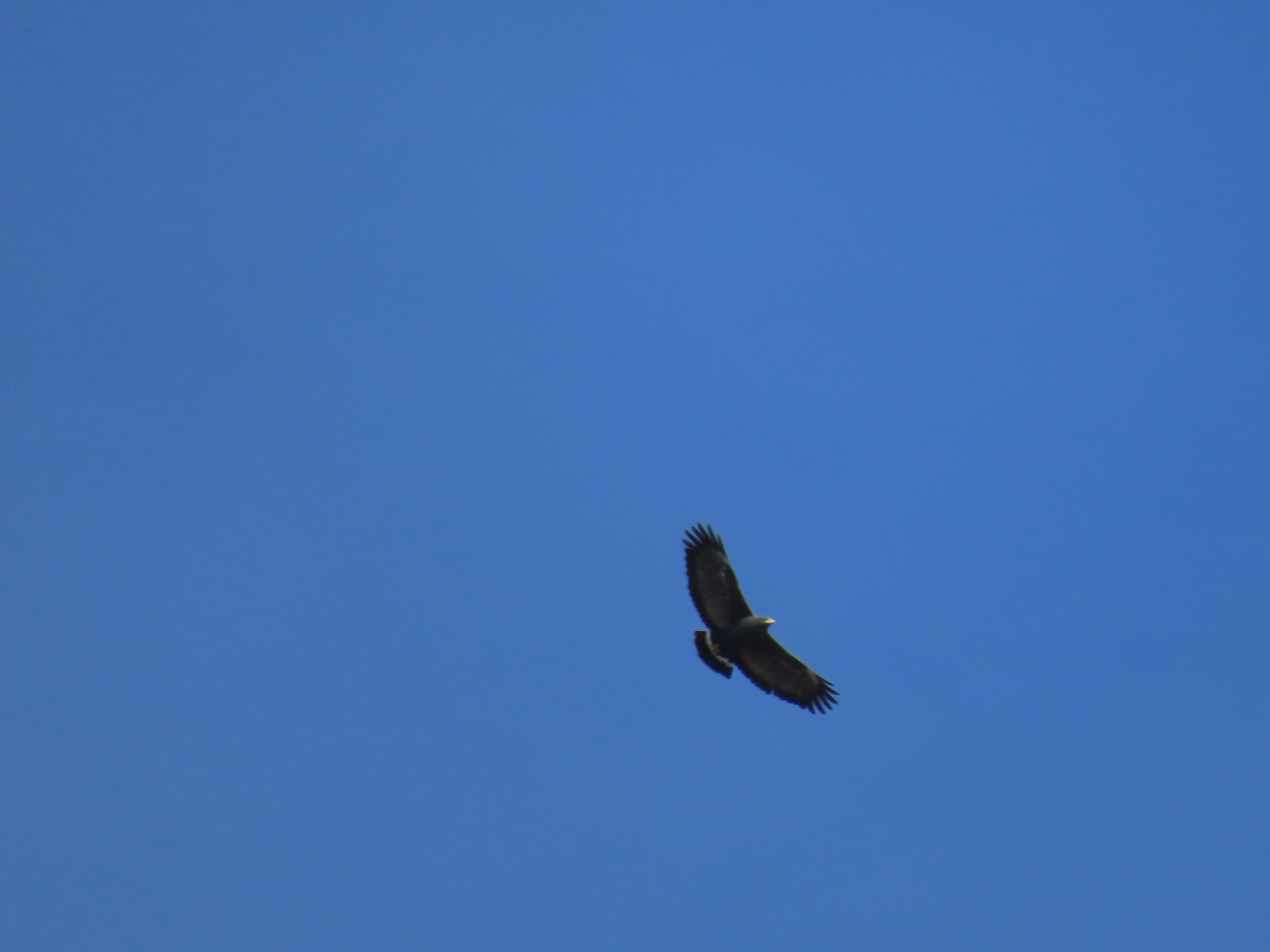 I put bins on the bird and thought it was either a zone-tailed or a common black hawk. I raised my camera up and got off four shots before the hawk moved over the ridge. I would sort out identification later when I got a better look at the photos.