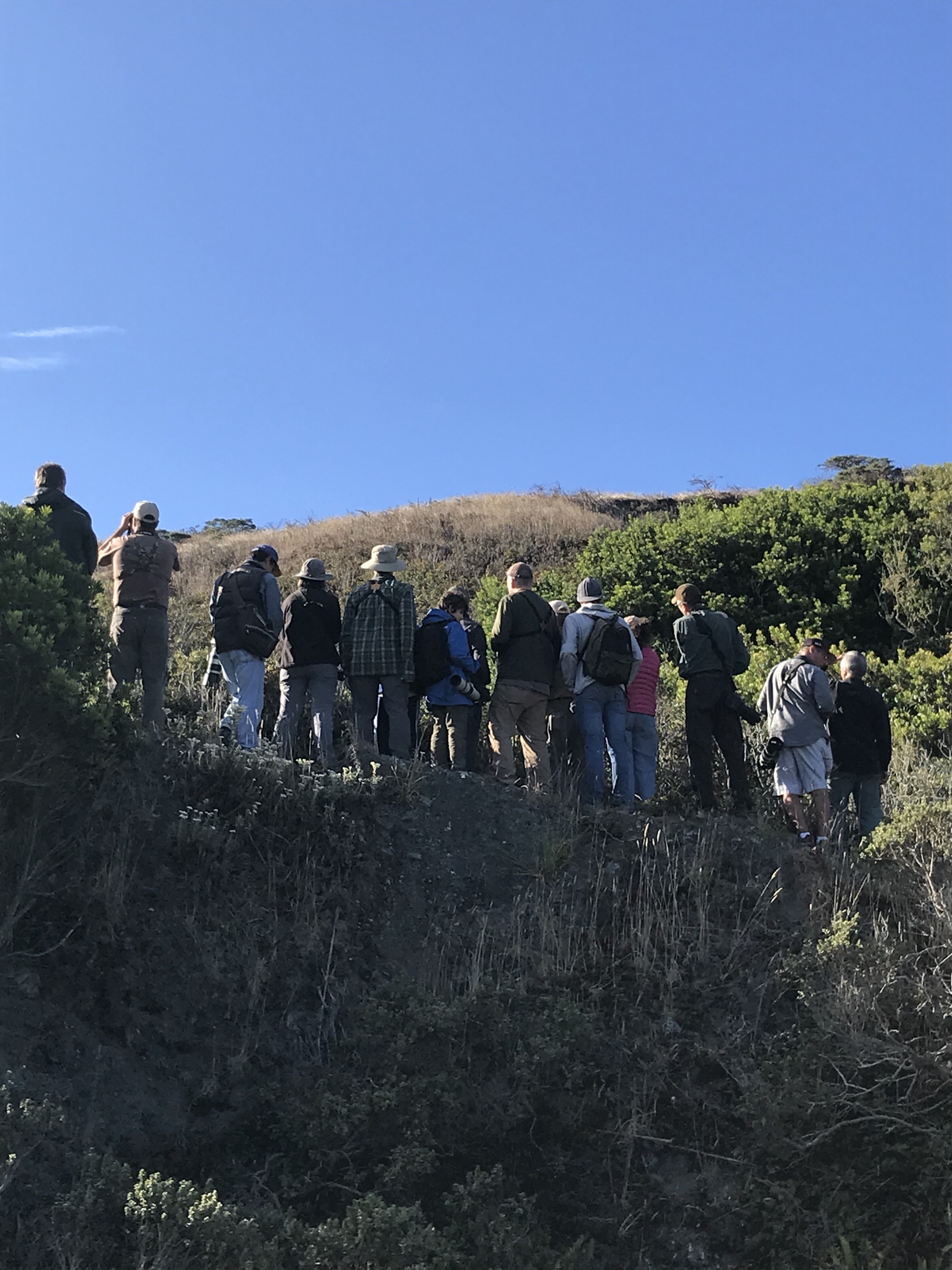 The maddening crowd on the ridge looking into the willows where the golden-winged warbler used to be.