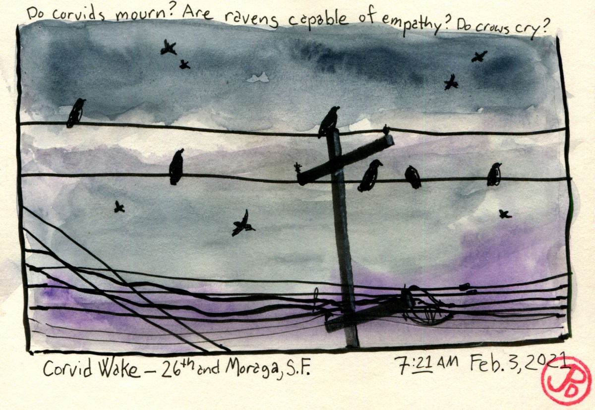 I walked a block further and as I came to the intersection of Noriega and 26th Avenue, I could hear the eruptions of crows and ravens one block over.