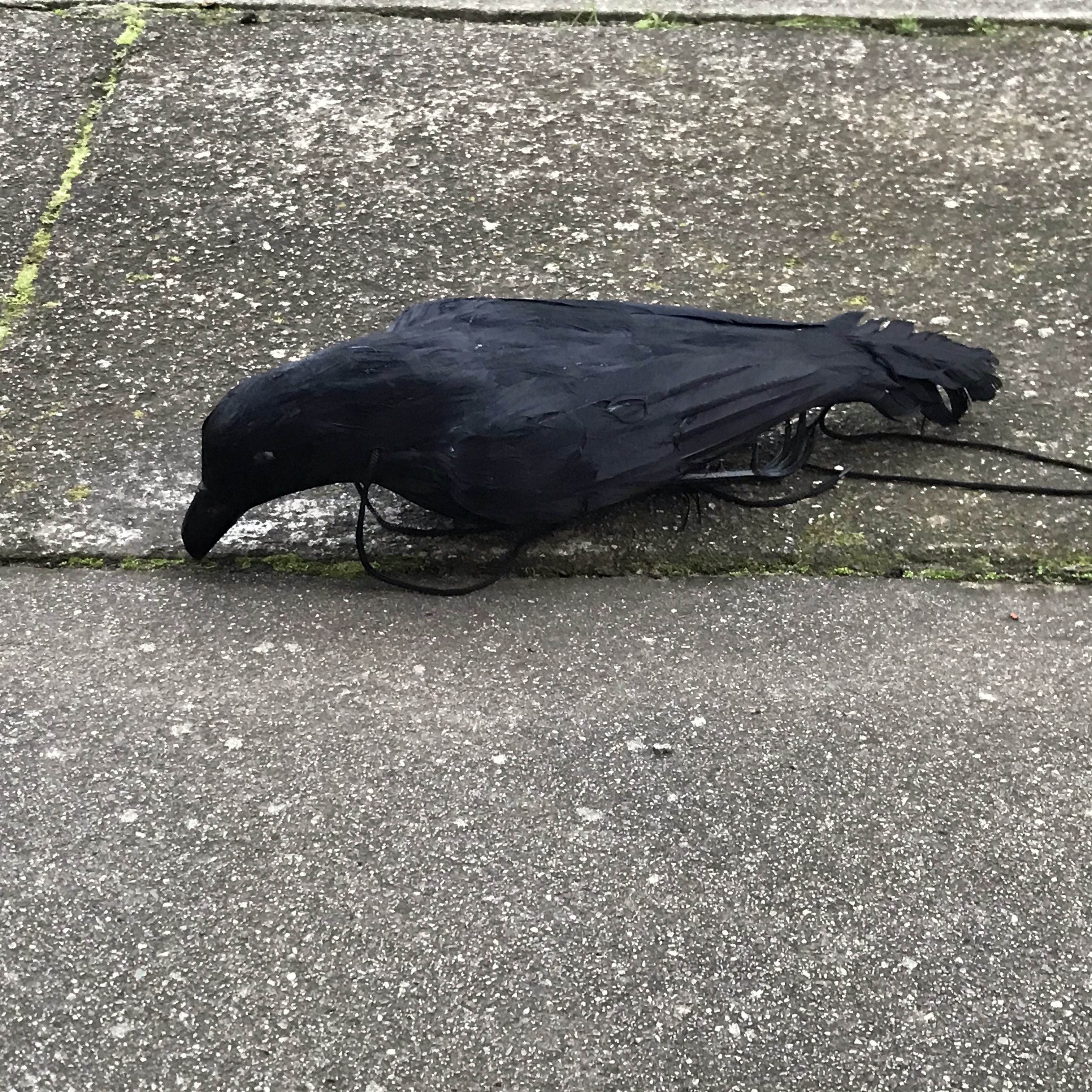 I told her that a dead raven was on the corner and this had attracted the attention of the corvids. When I took a closer look at the “raven” I realized that it was just a faux bird.
