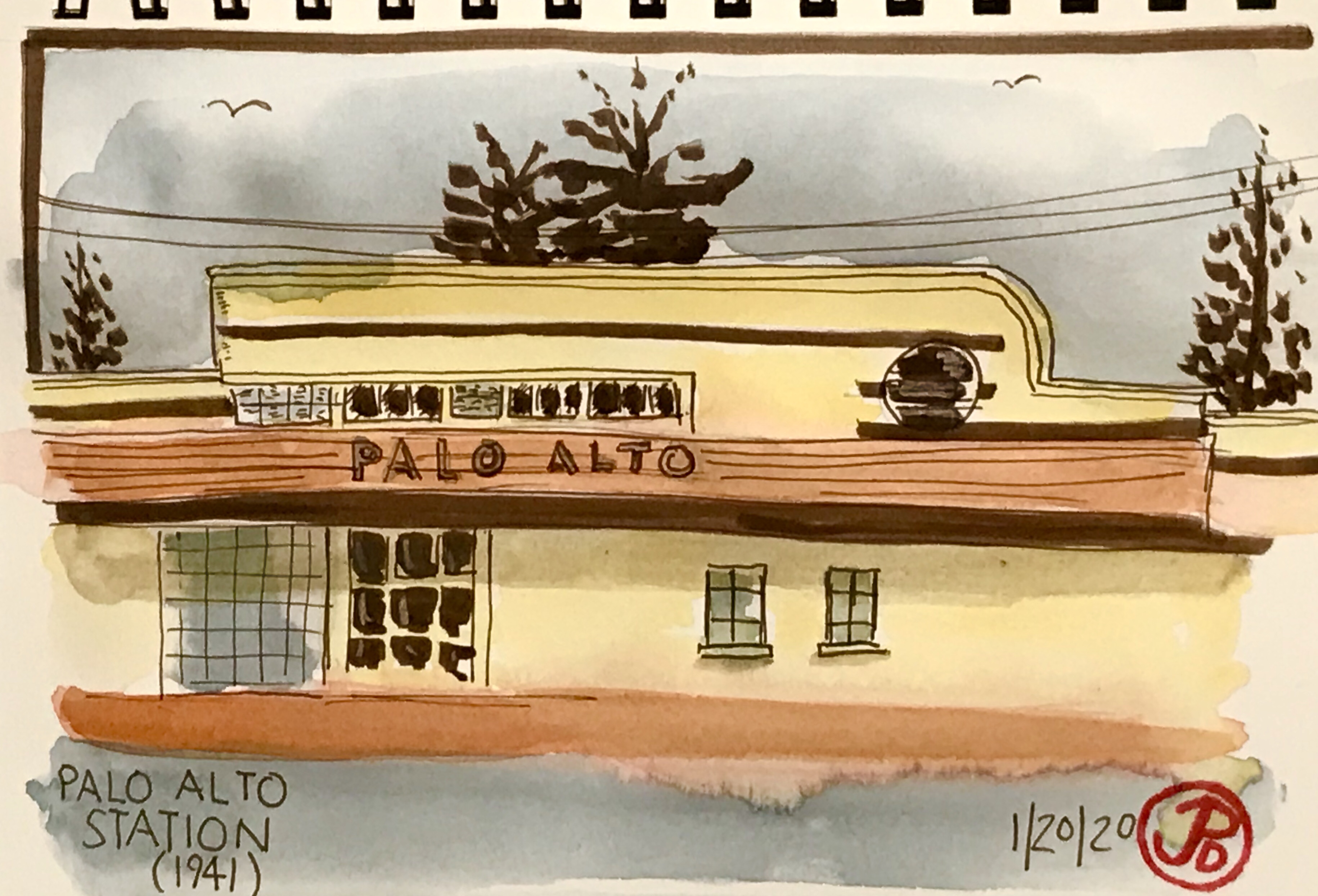 Here is my quick sketch of Caltrain’s most “modern” historic station. I left details out, like the door into the station. I was really trying to get the shapes of the building.