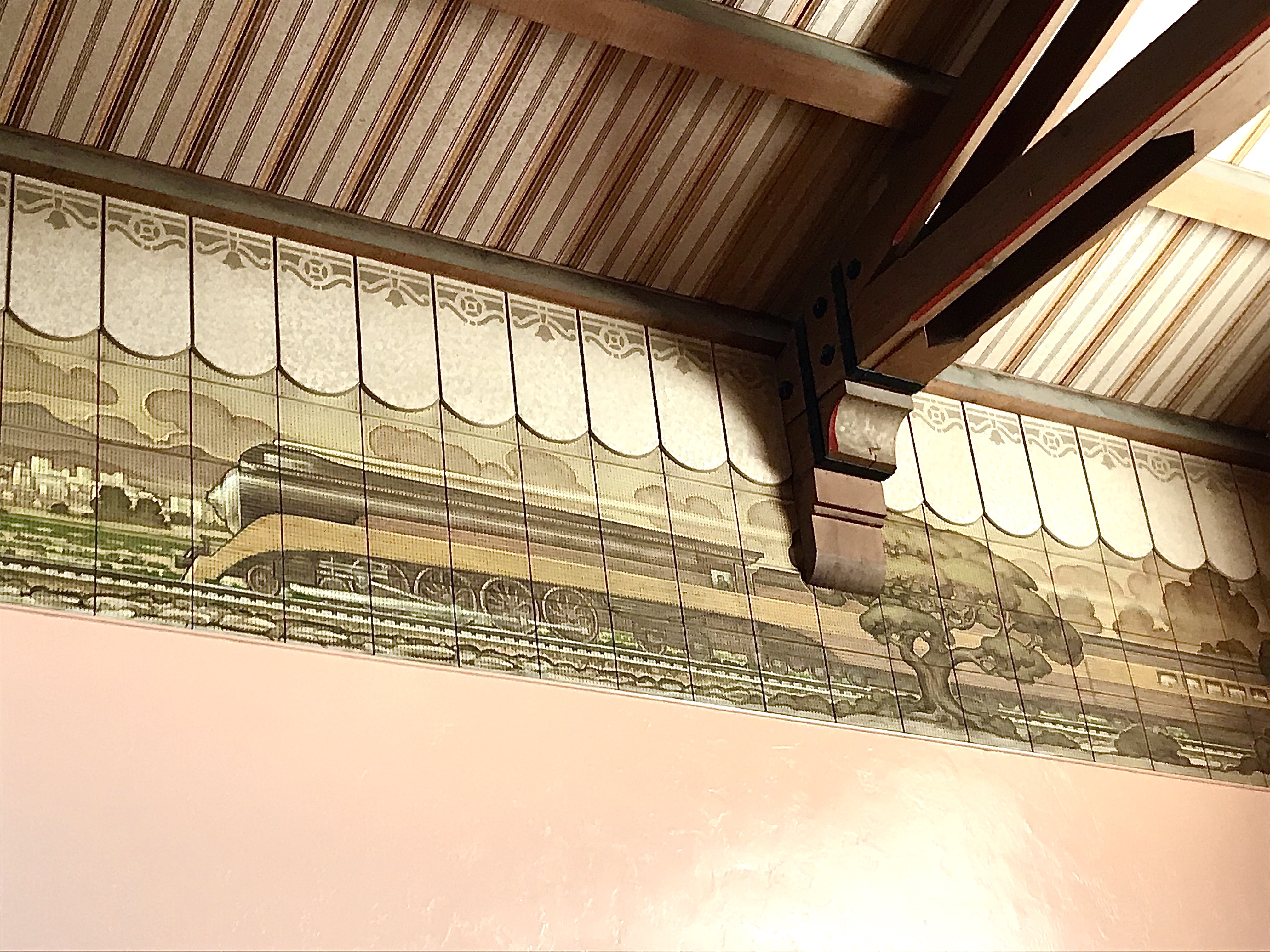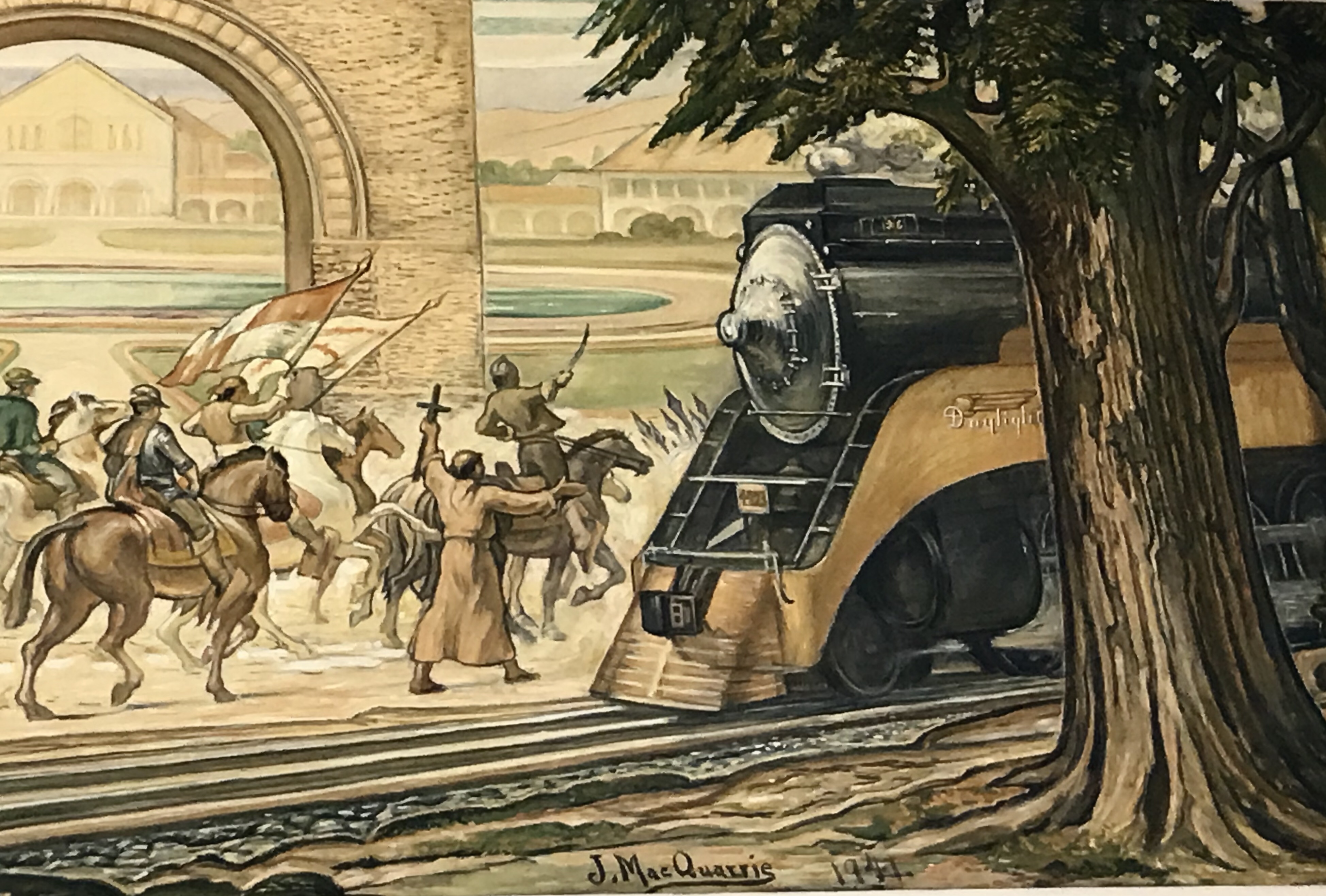 The mural stretches above the wall where the ticket counter is. It depicts the past and future of transportation. A stream of men on horses, Indians with travois, wagons, stage coach, and men and women walking on foot, head to the right with the quad of Stanford University in the background. In the lower left corner the profile of Leland Stanford looks on towards the future of transportation (circa 1940). The future seems to come out from behind the trees as a Daylight GS-3 locomotive proclaims it’s entrance into the mural. This certainly a synthesis between a beautiful and functional form of transportation and a building that does the same.