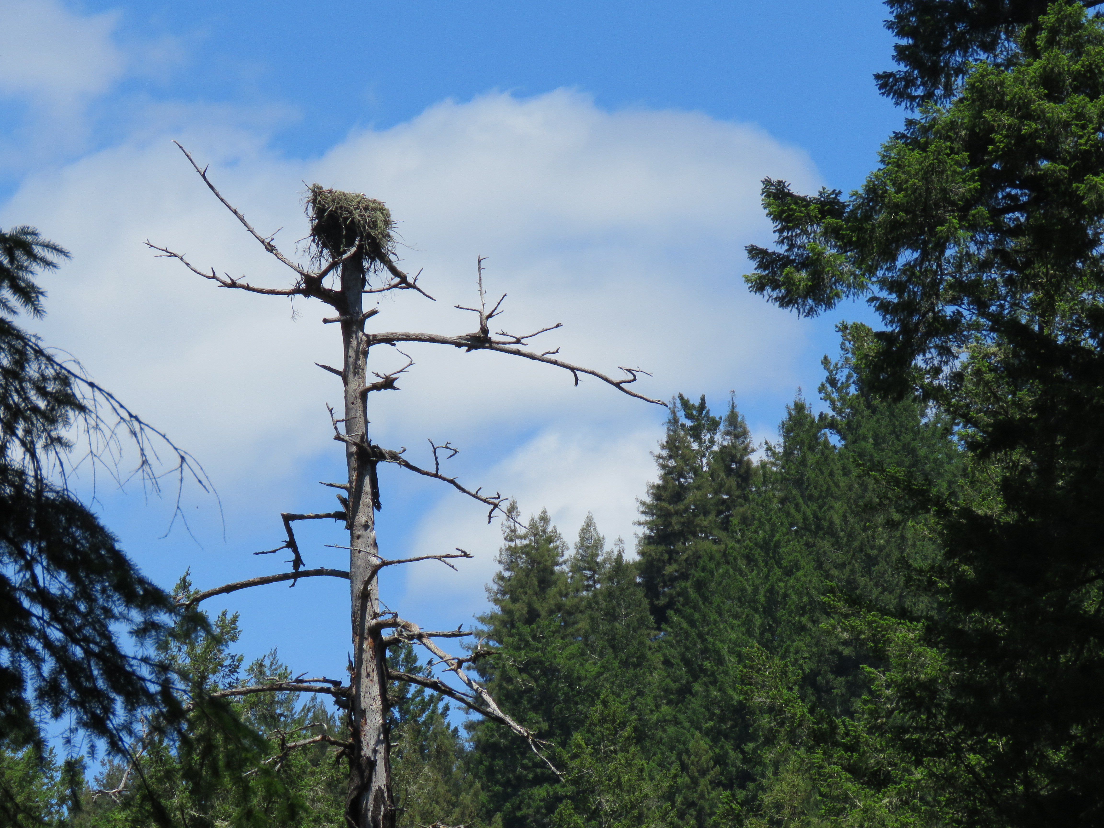 I parked on Highway 9 and headed down the Ox Fire Road towards the railroad and Garden of Eden. When I was halfway down the trail I heard the primeval calls of our largest woodpecker: the pileated. On a Douglas-fir snag, about 100 yards from the railroad, I spotted a family group of four pileated woodpeckers! Either this was a good omen for my dipper search or a great consolation for dipping.
