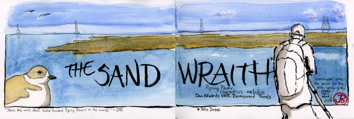 What followed was a play by play of the piping’s location and movement; “Do you see the five wigeon in the far channel? Just to the right below the two pylons? The plover is moving to the right. Passing near the green shrubbery. Now it’s facing us, right near the two ruddy ducks now. It’s now going left just past the two semipalms.”
