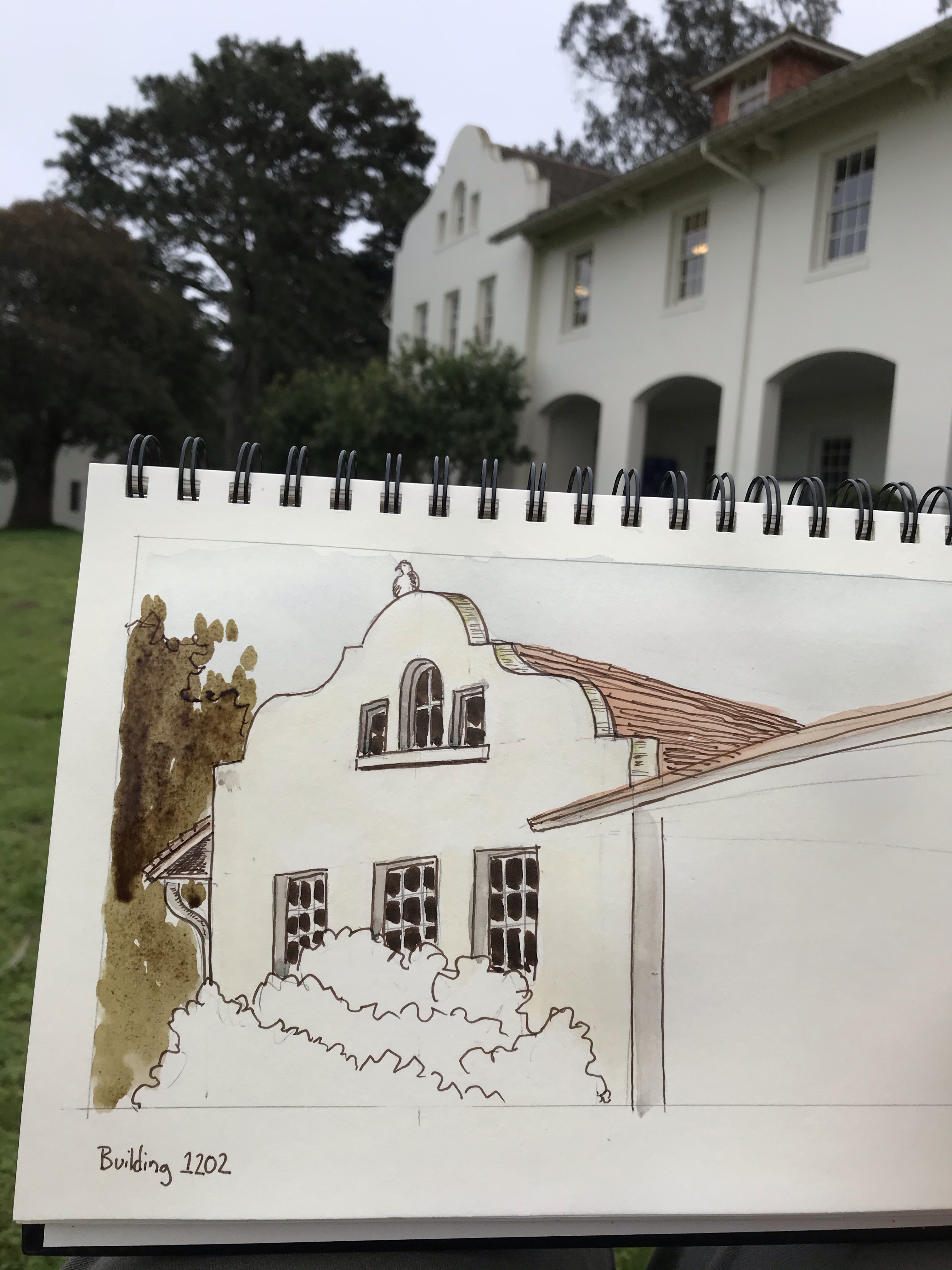 Building 1202 now houses the Presidio Graduate School and the World Economic Forum. Both sound a bit mysterious. People kept coming and going from the building. Some where getting on their bikes to ride home. A young woman bikerider stopped and asked me what I was doing. I told her that I was drawing the building and noted that that it was beautiful. She replied that she was “spoiled” to work in the building. These are the nice little conversations you frequently have when urban sketching, it really seems to take out the threat and the isolation of being in the city when people see your sketching.